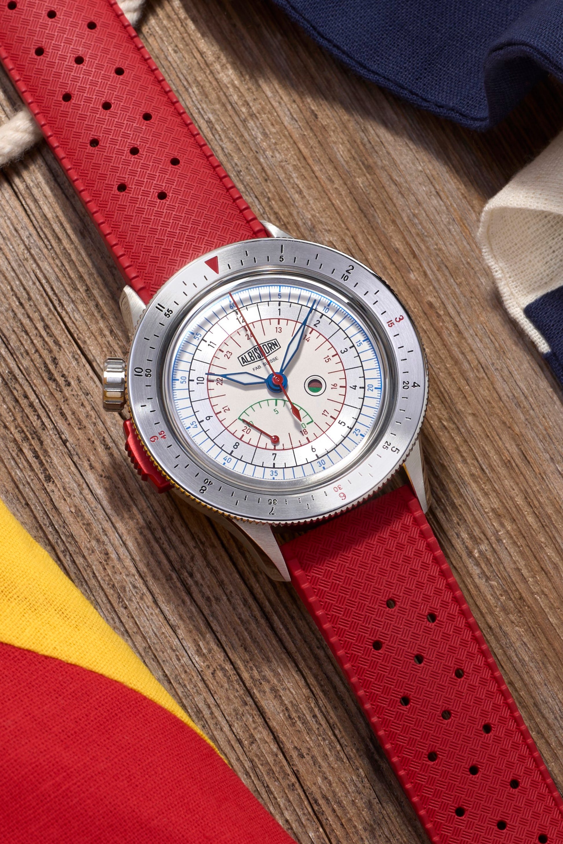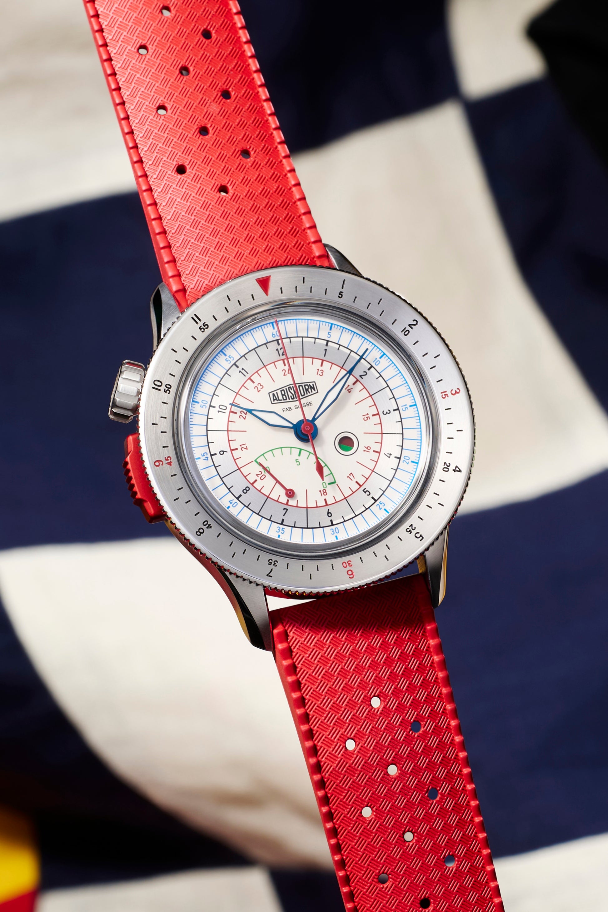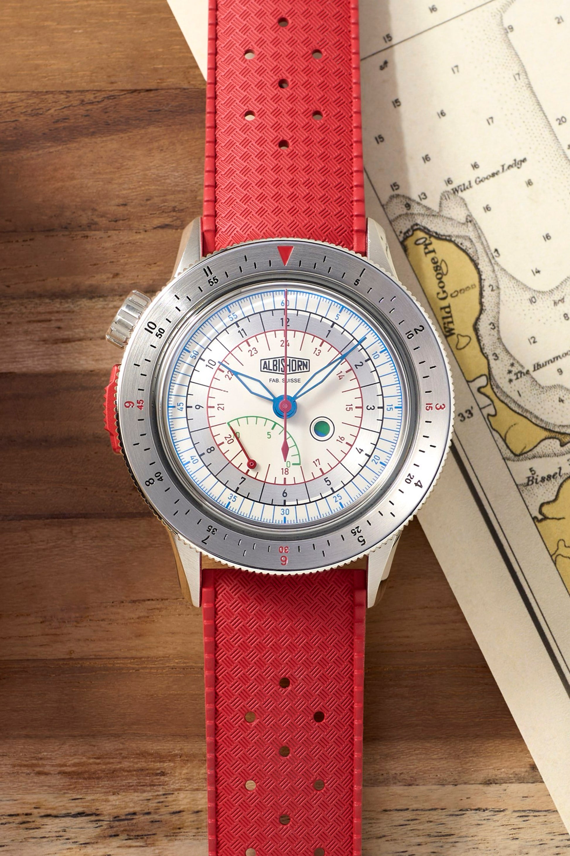 • Red rubber strap with stainless steel Albishorn logo buckle.
