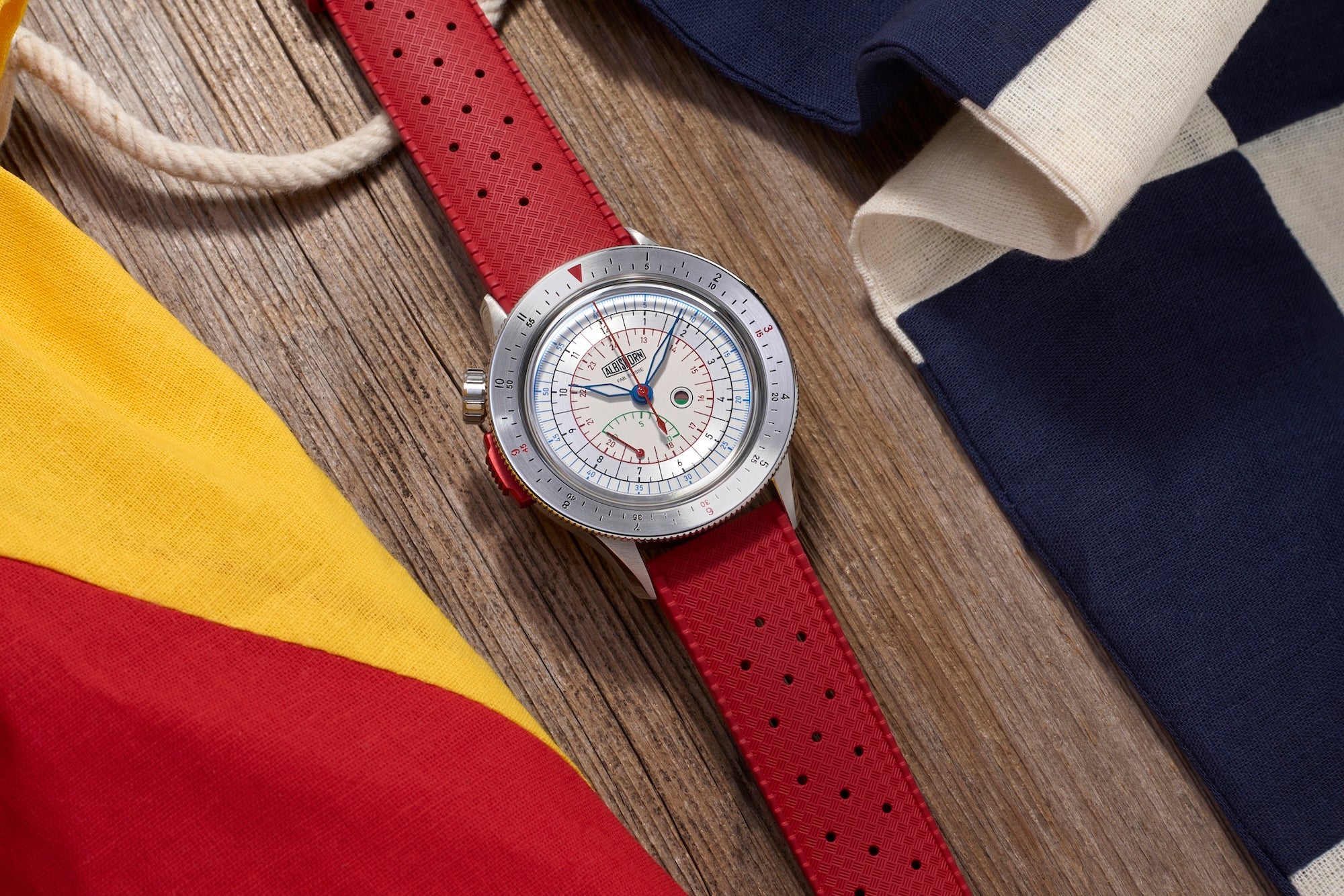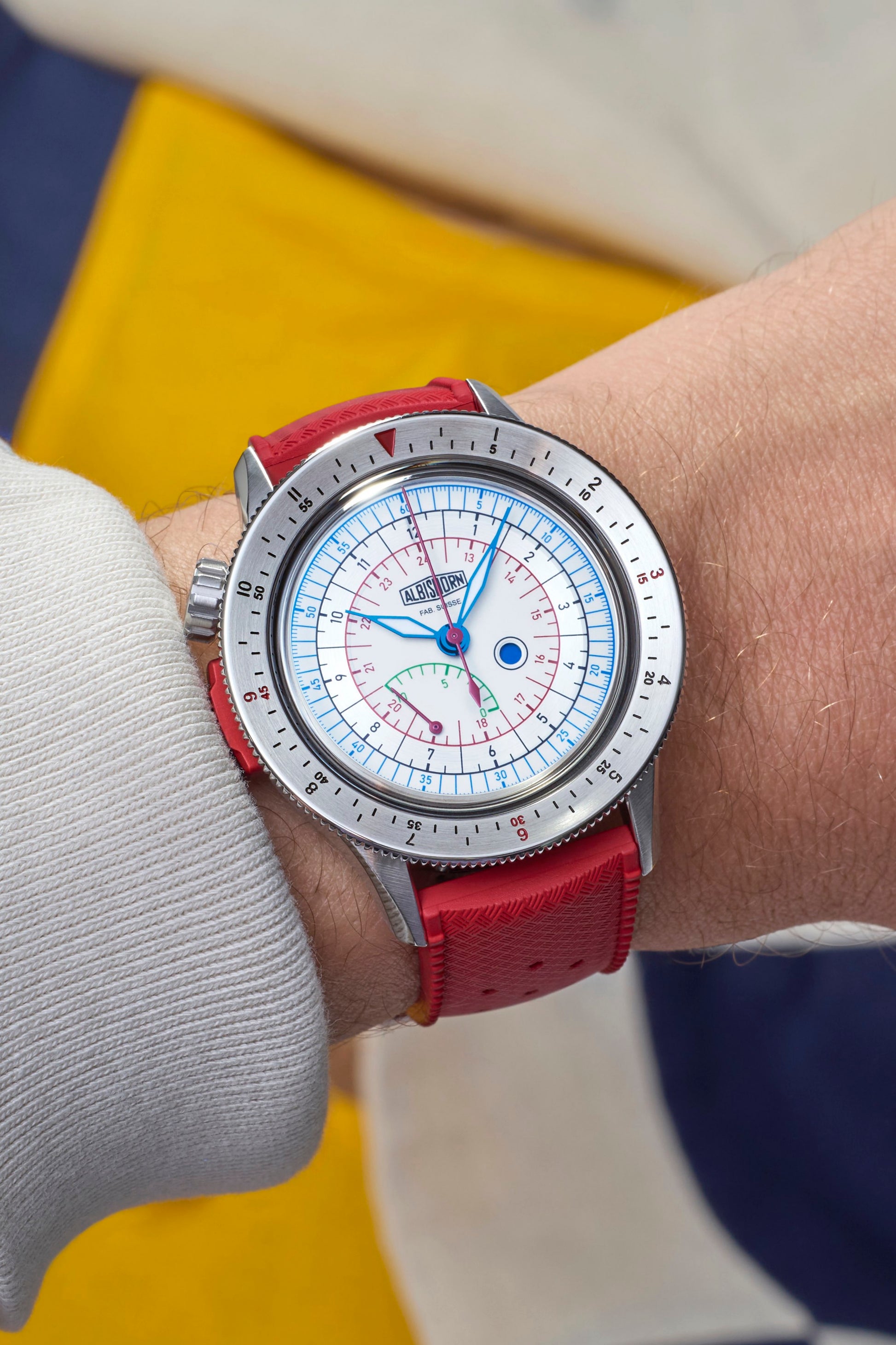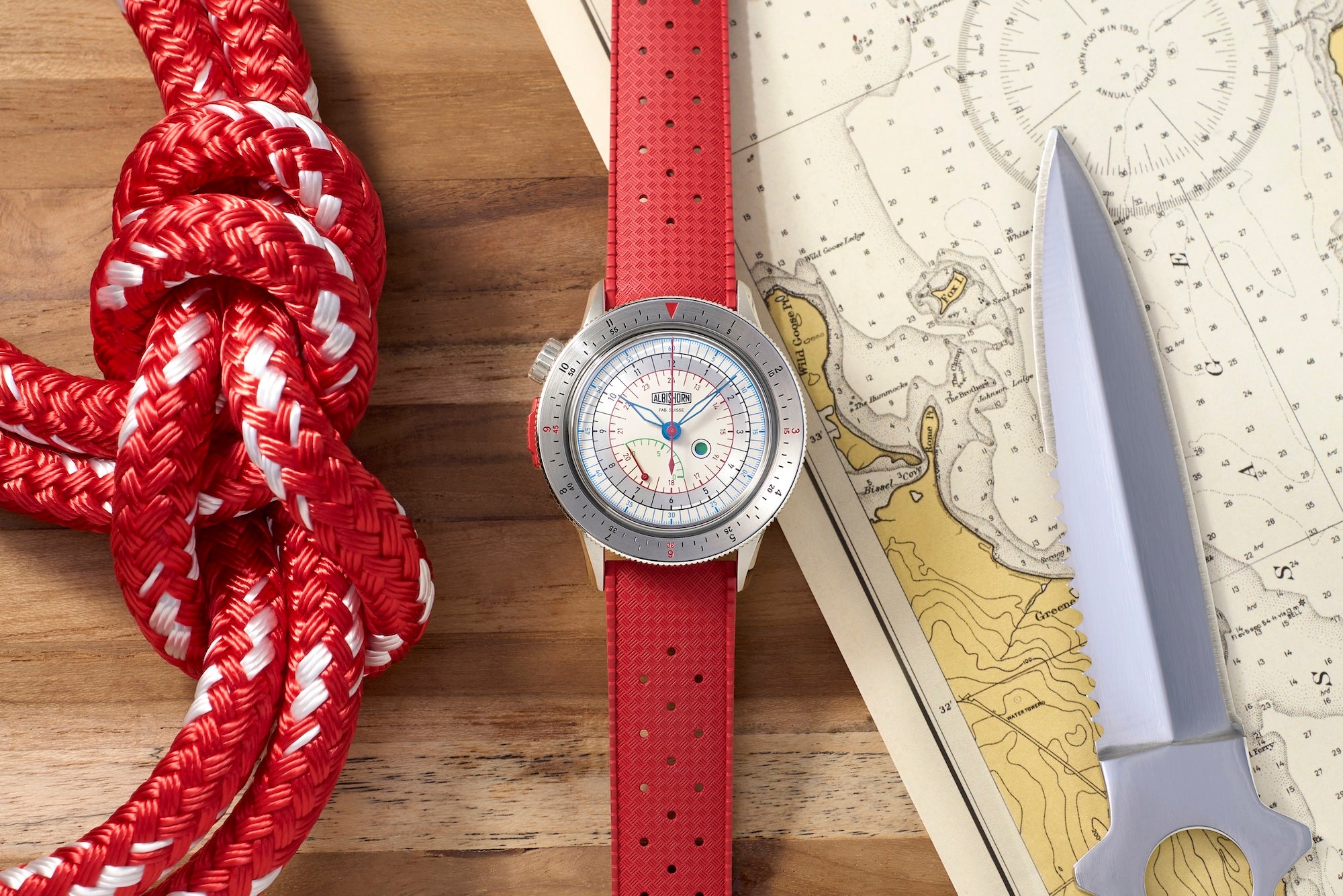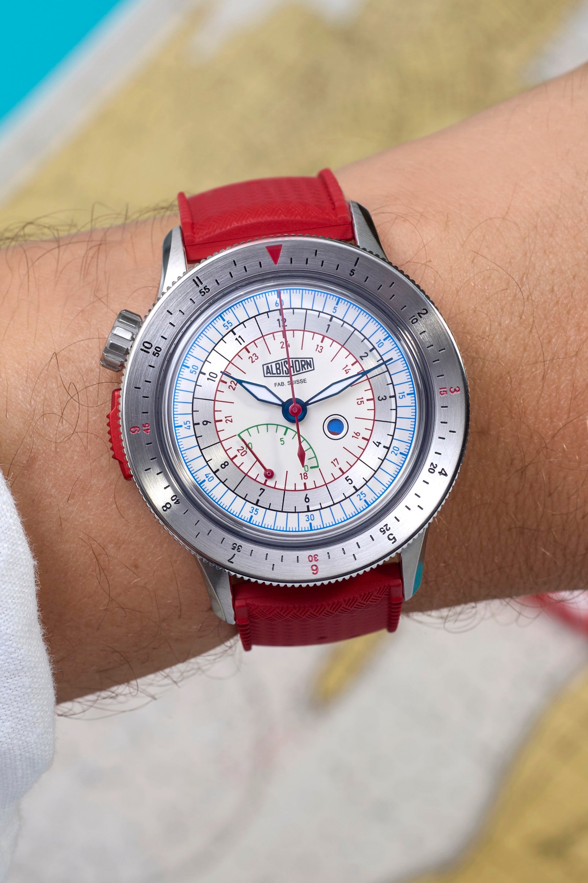 • Red rubber strap with stainless steel Albishorn logo buckle.
