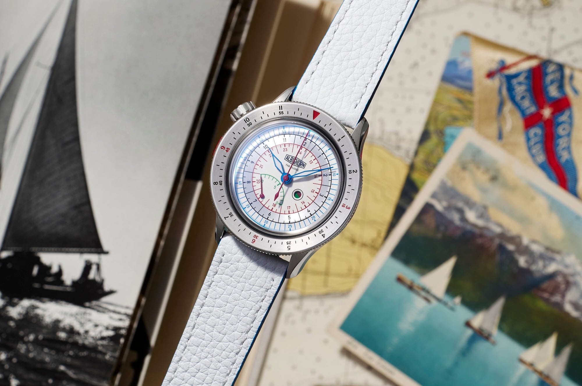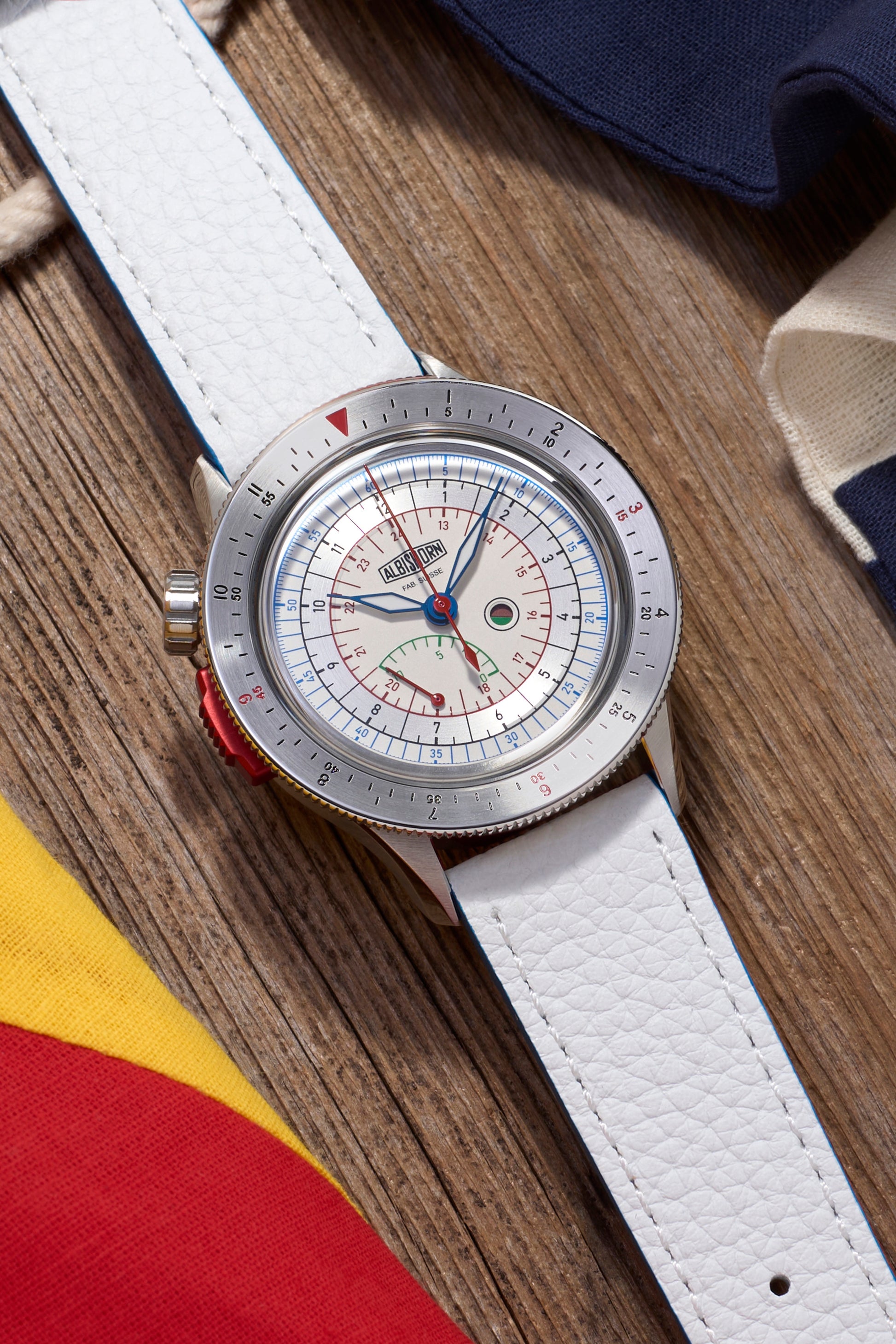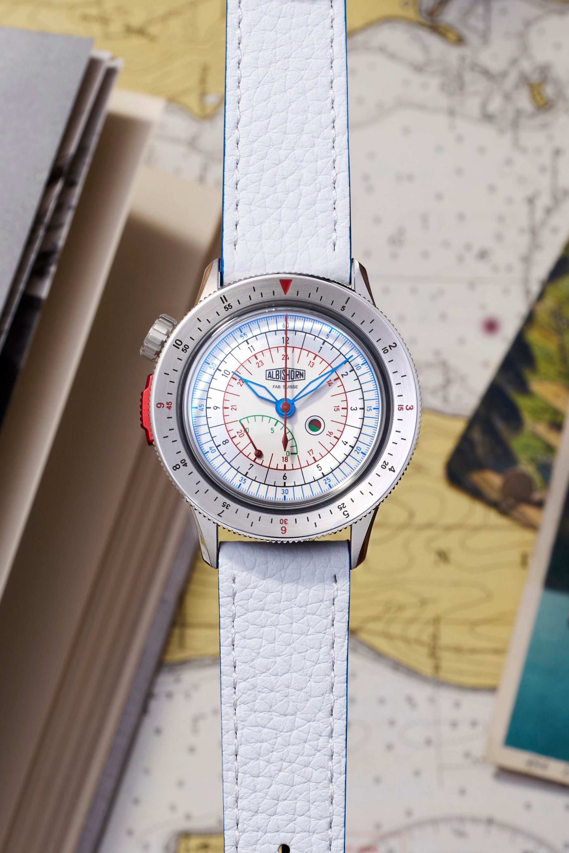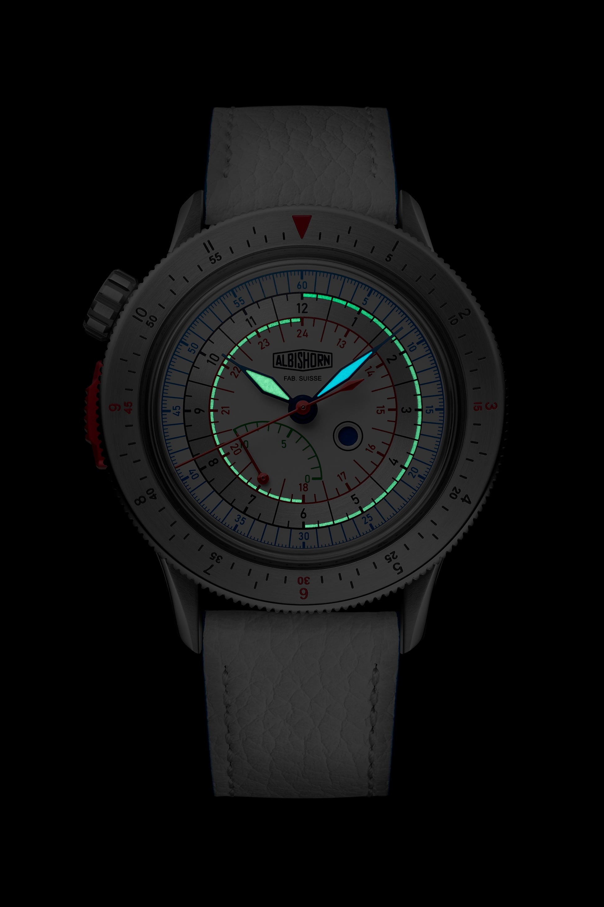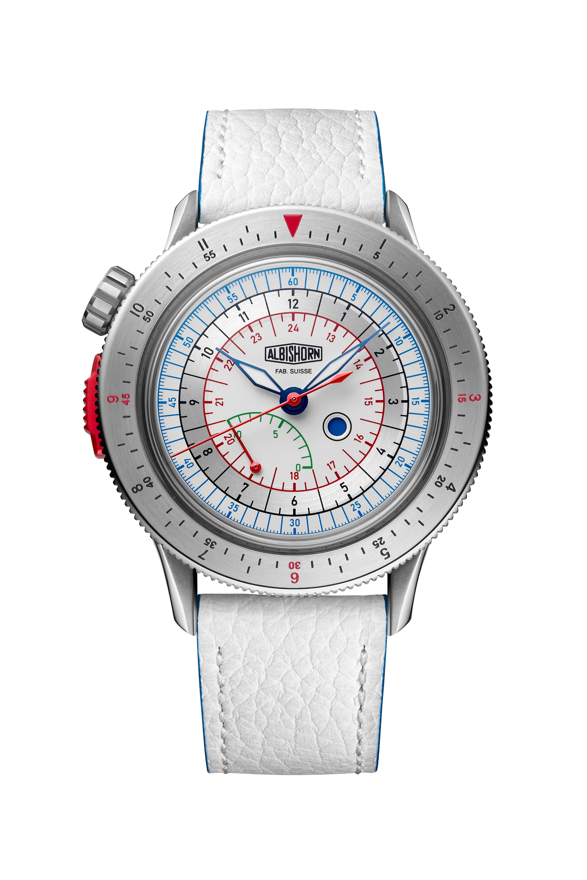 • Watch delivered with with an alternate strap in white calfskin, also with a stainless steel Albishorn logo buckle.