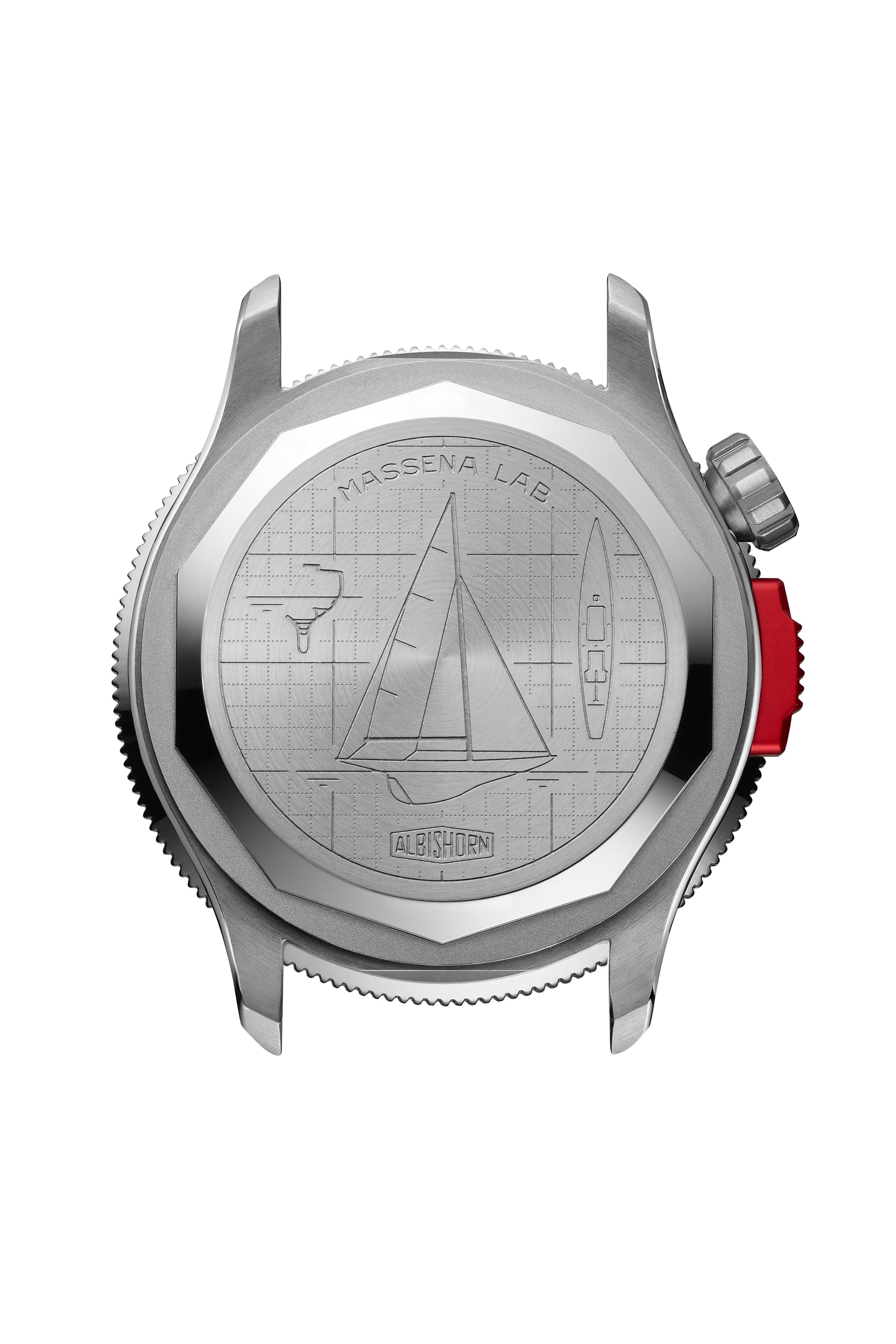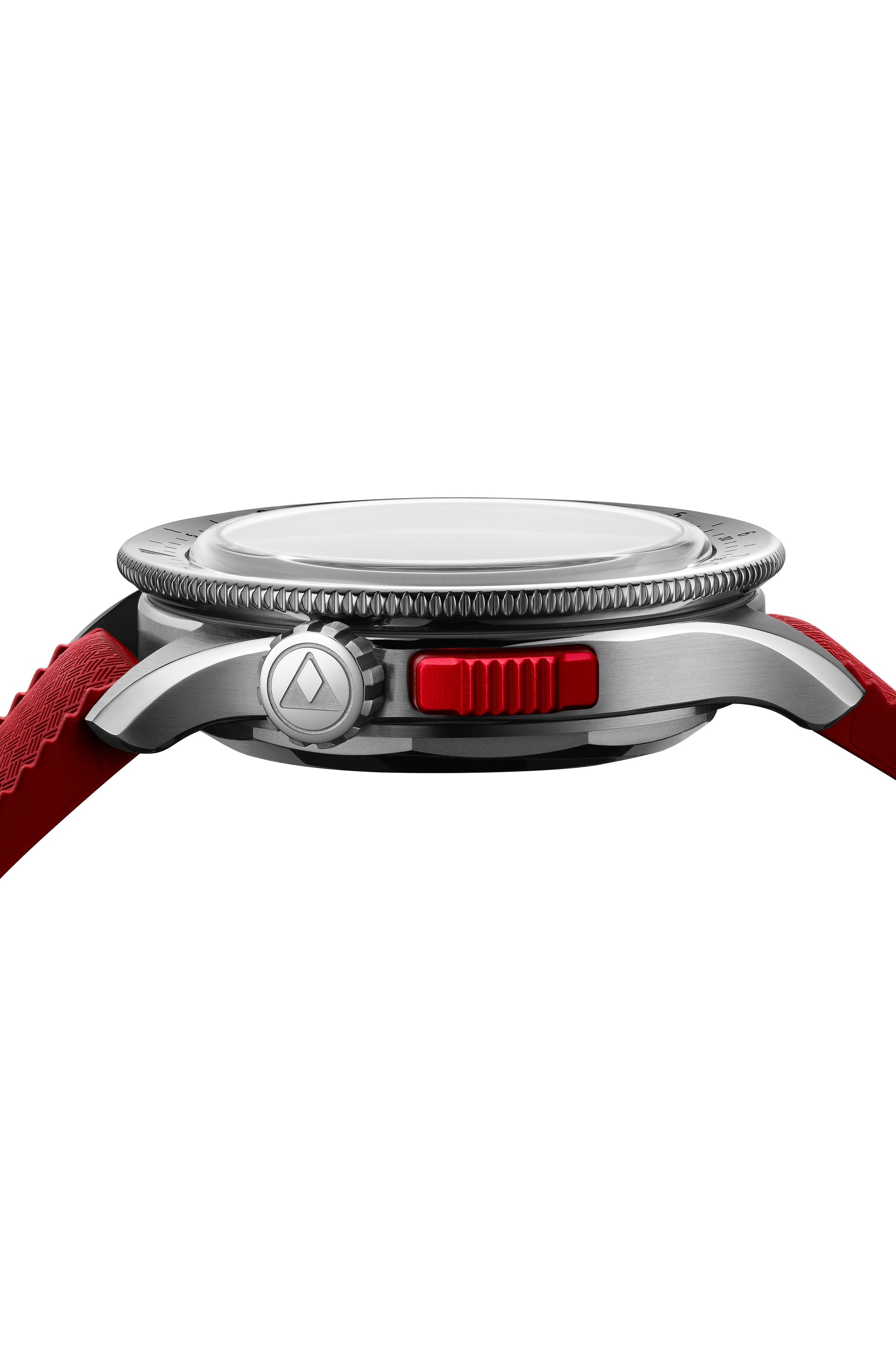 • Crown at 10 o'clock, red aluminum monopusher at 9 o'clock.