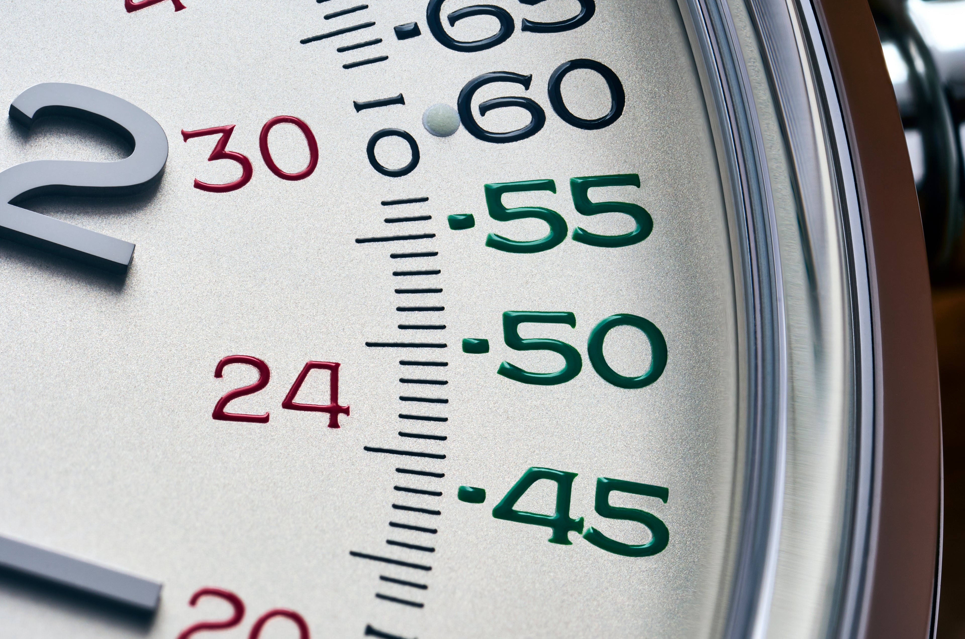 • Domed, silver opaline dial with medical scales in black, green, and red.