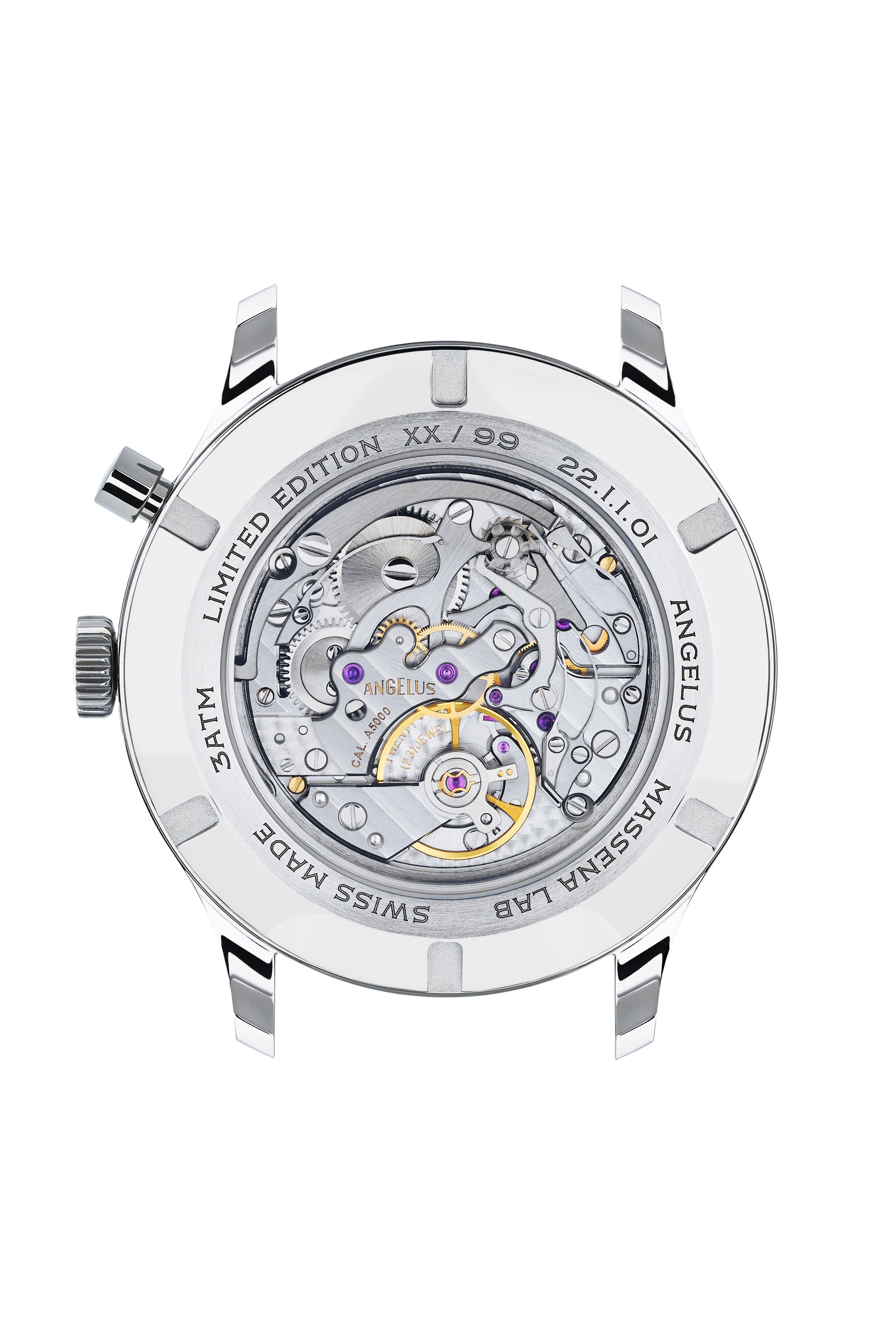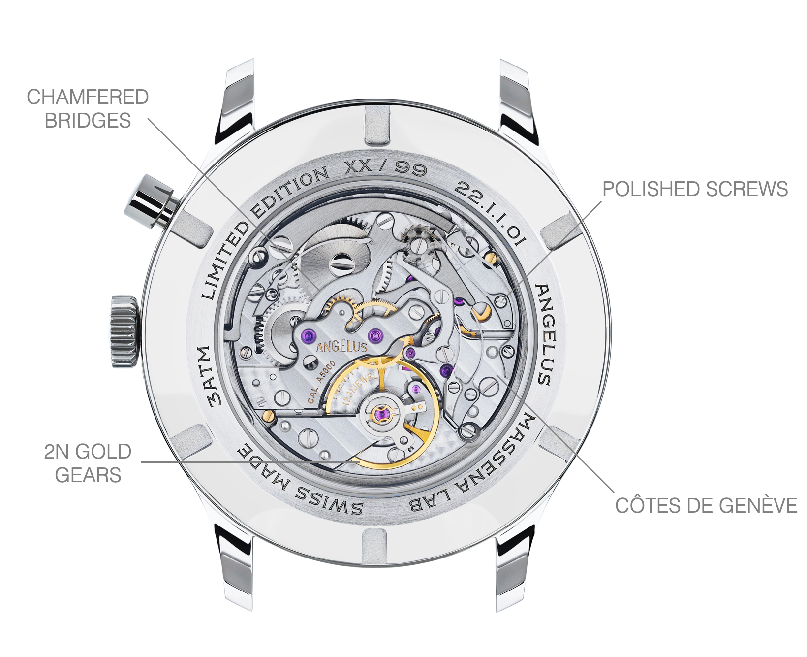 Manual-winding, Angelus caliber A5000, based on a monopousher chronograph movement developed by THA Ébauche.