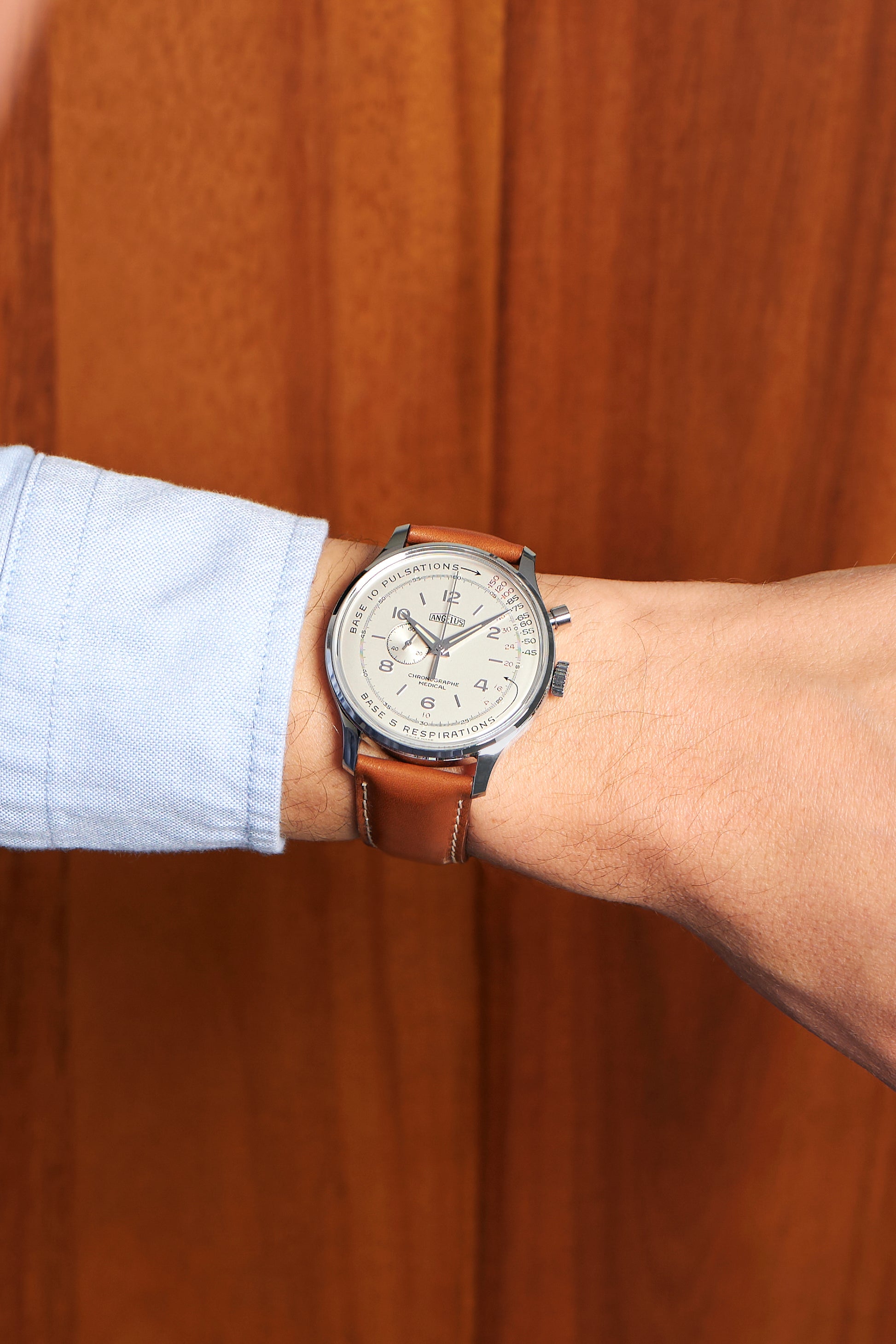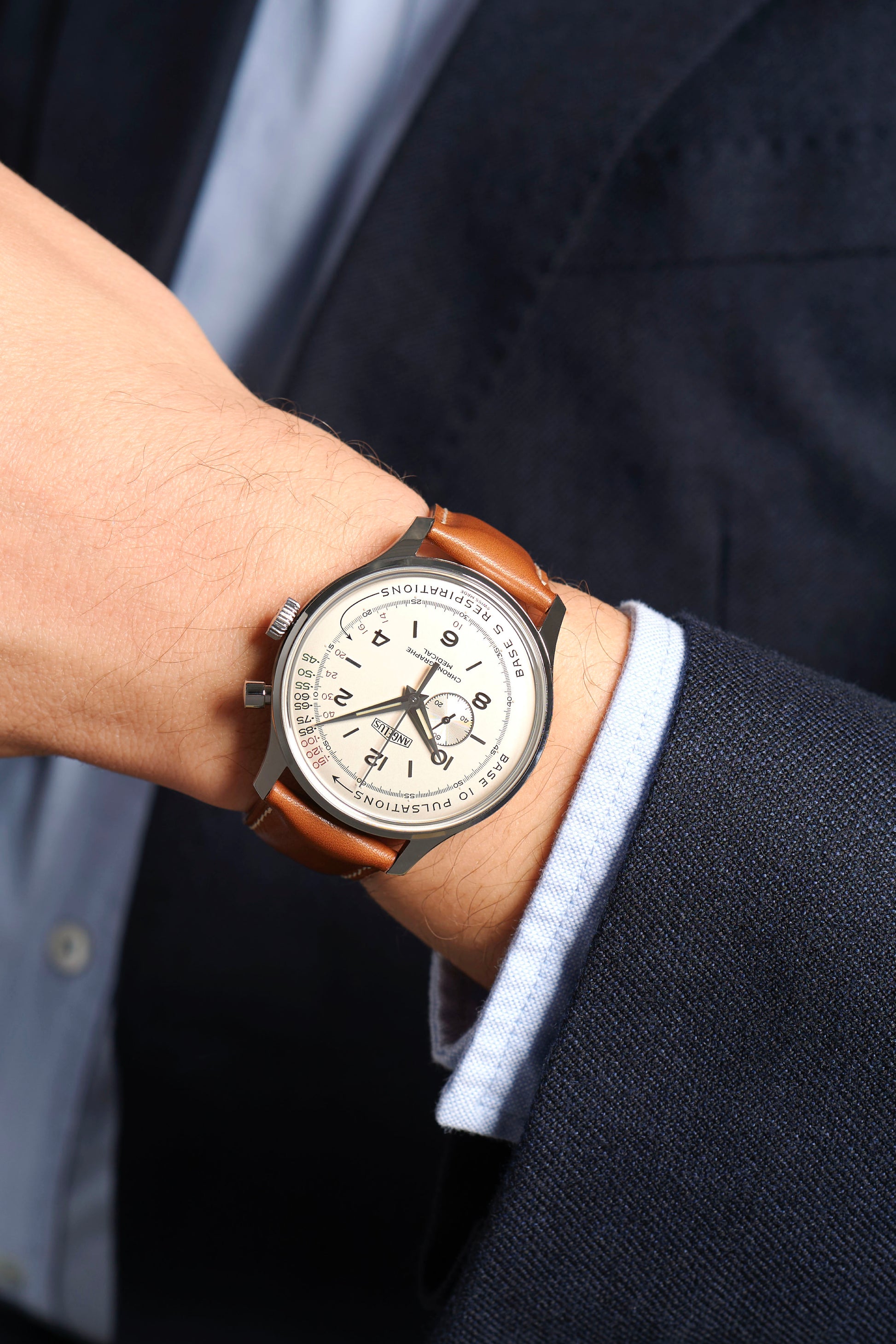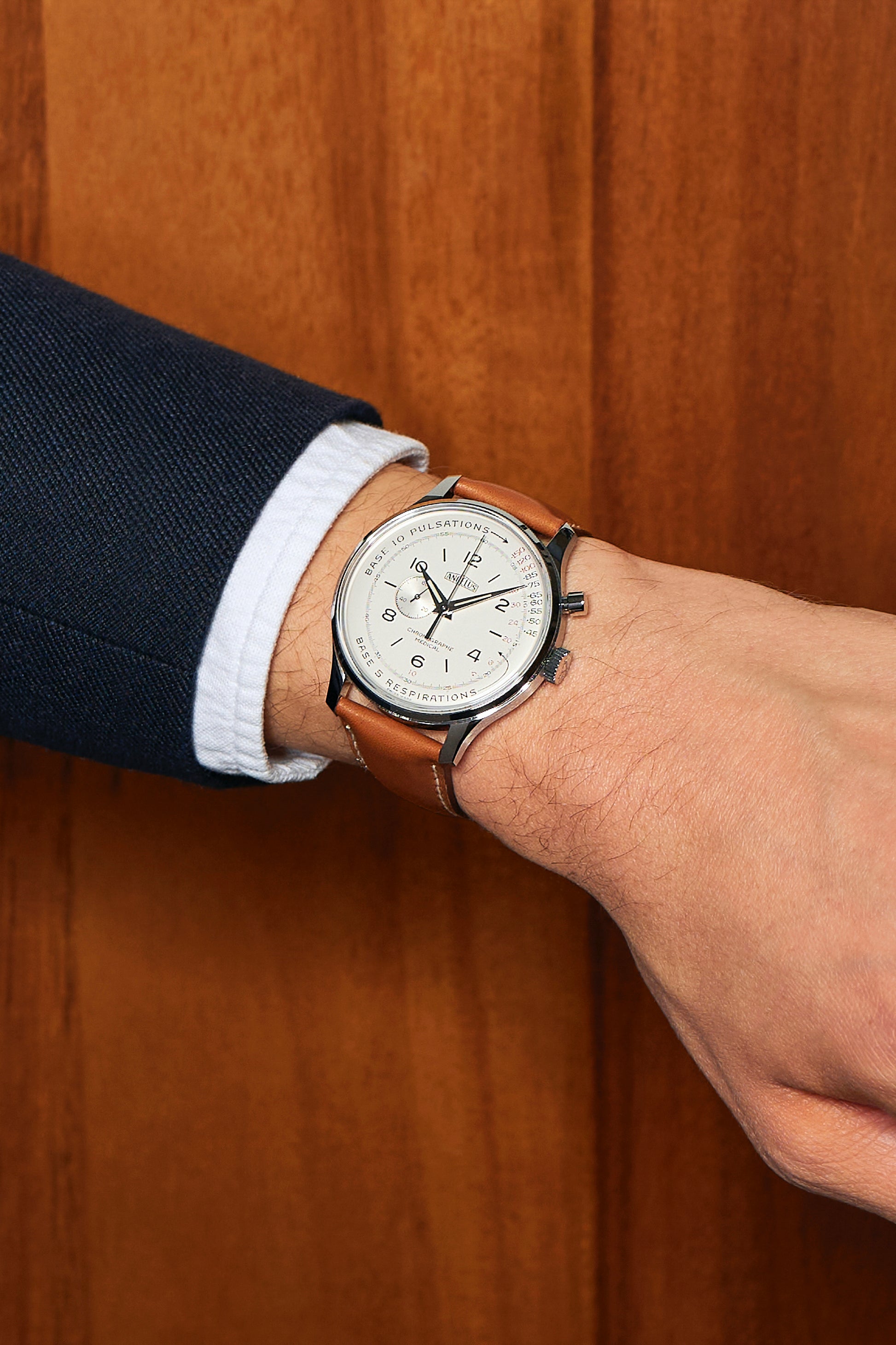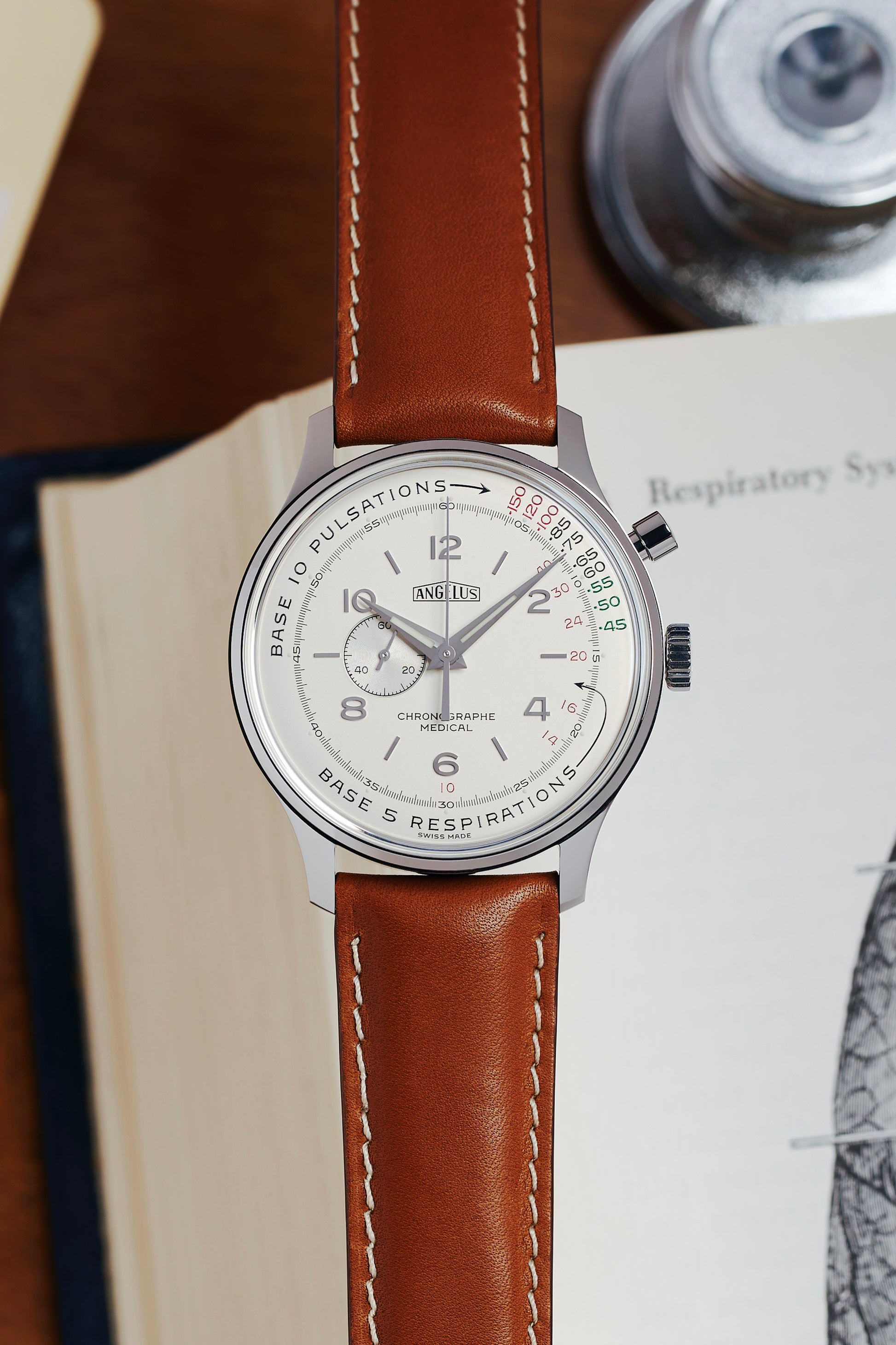 • Monopusher chronograph with small seconds, pulsometer scale, and asthmometer scale.