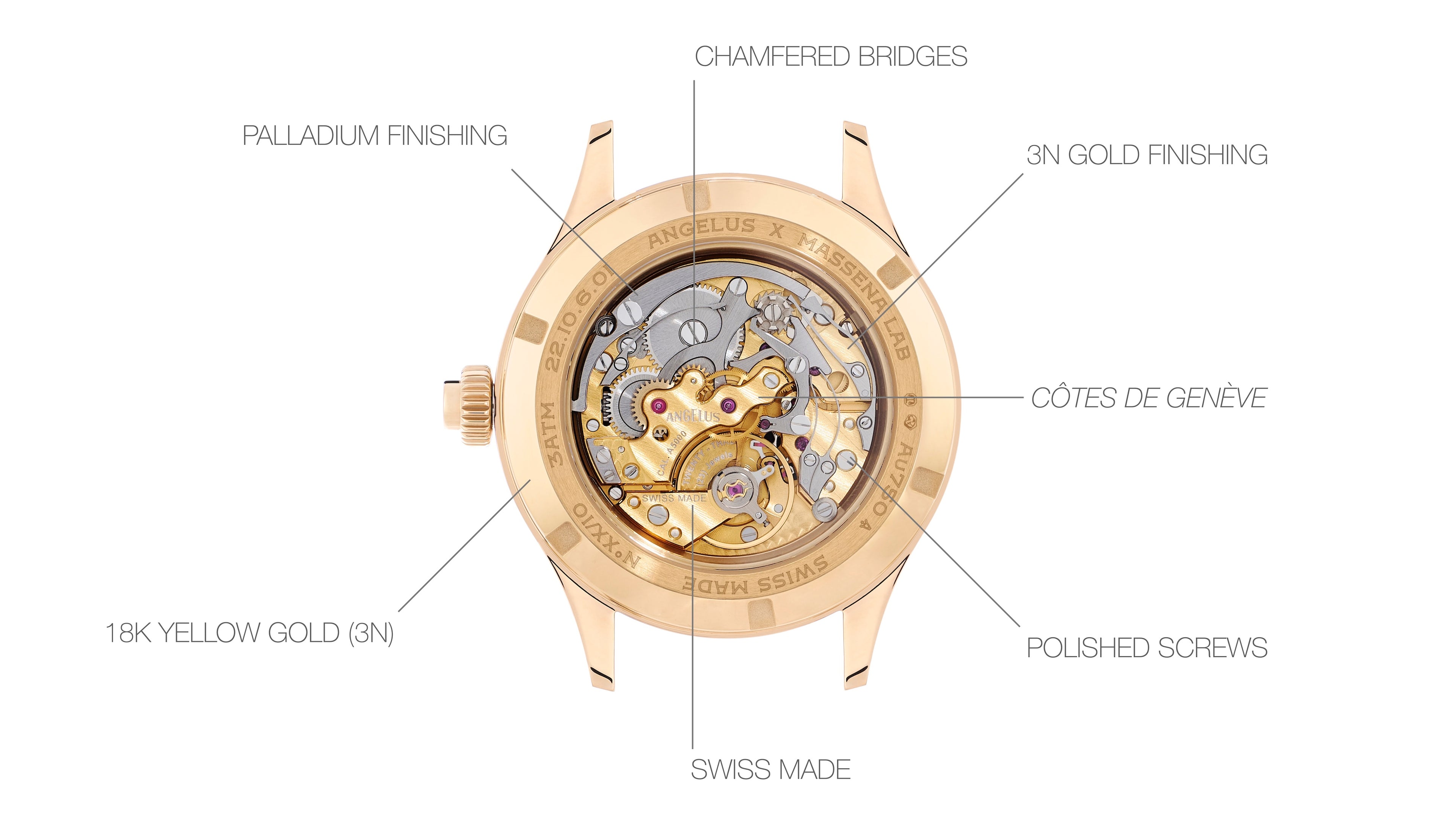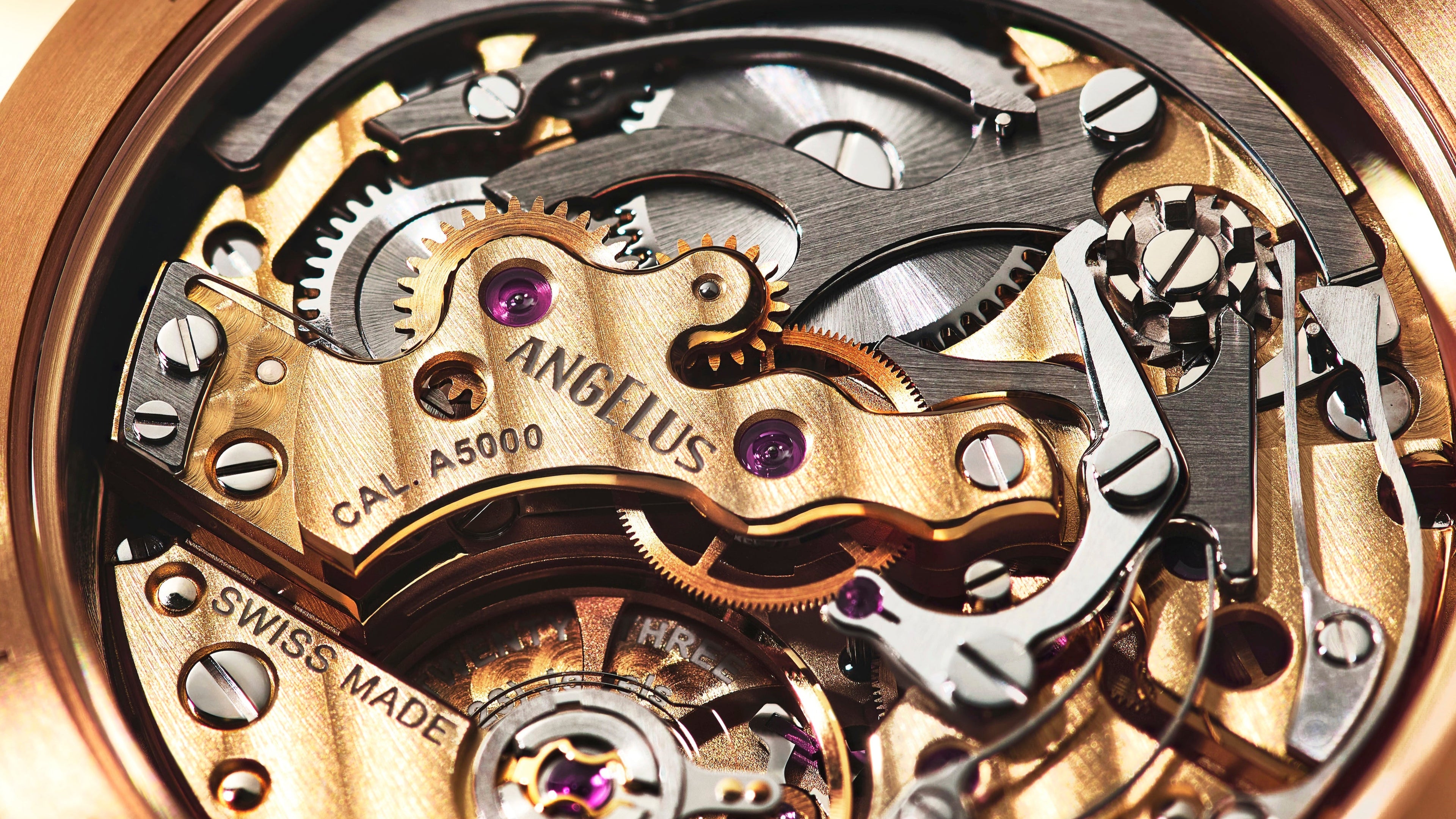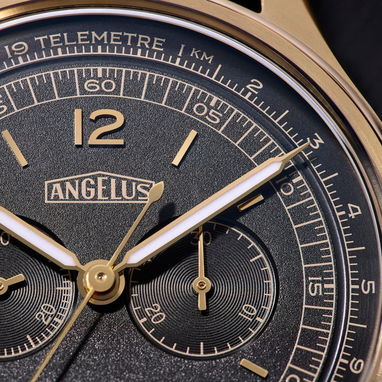 Manual-winding, Angelus caliber A5000, based on a monopousher chronograph movement developed by THA Ébauche.