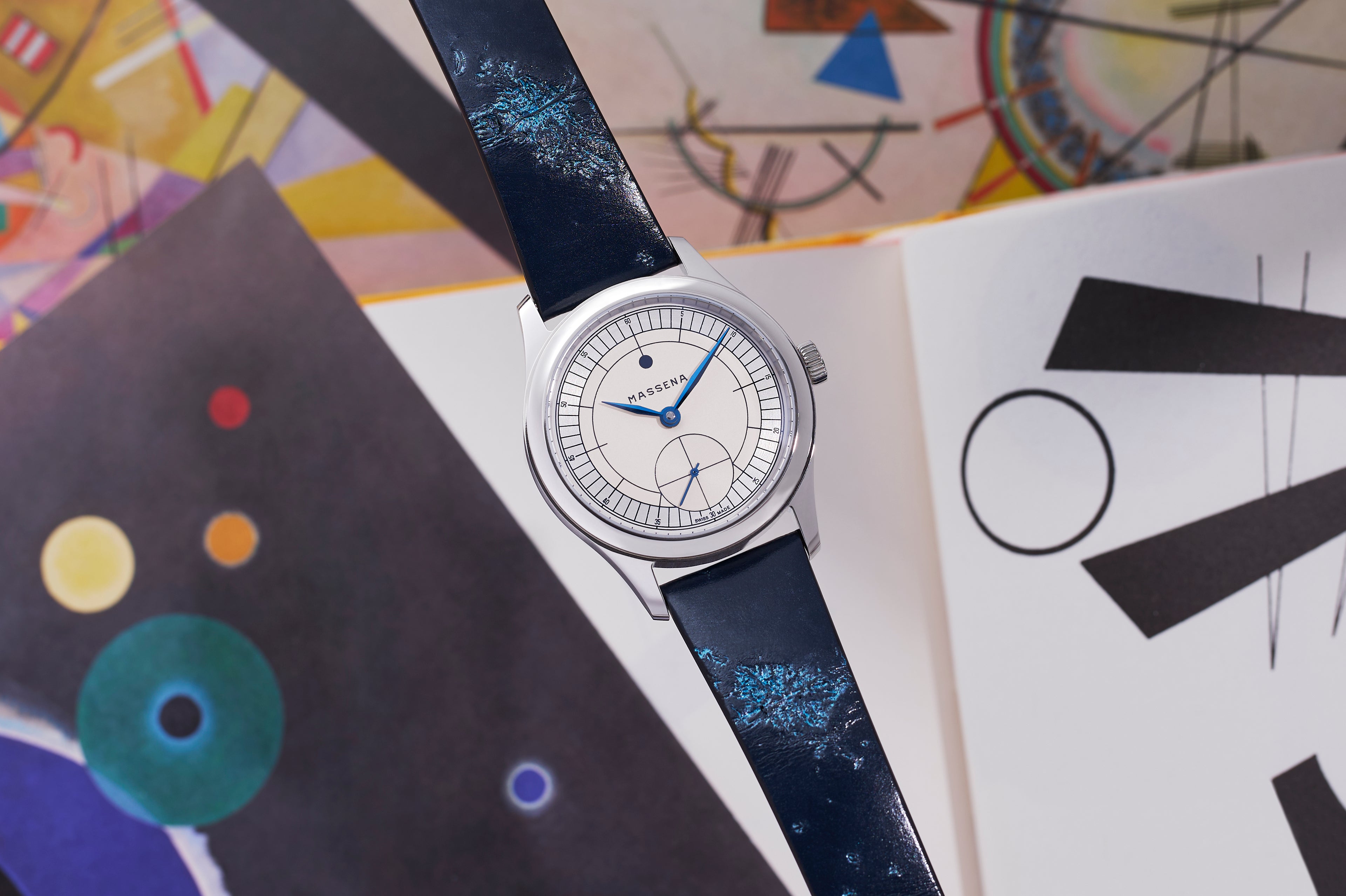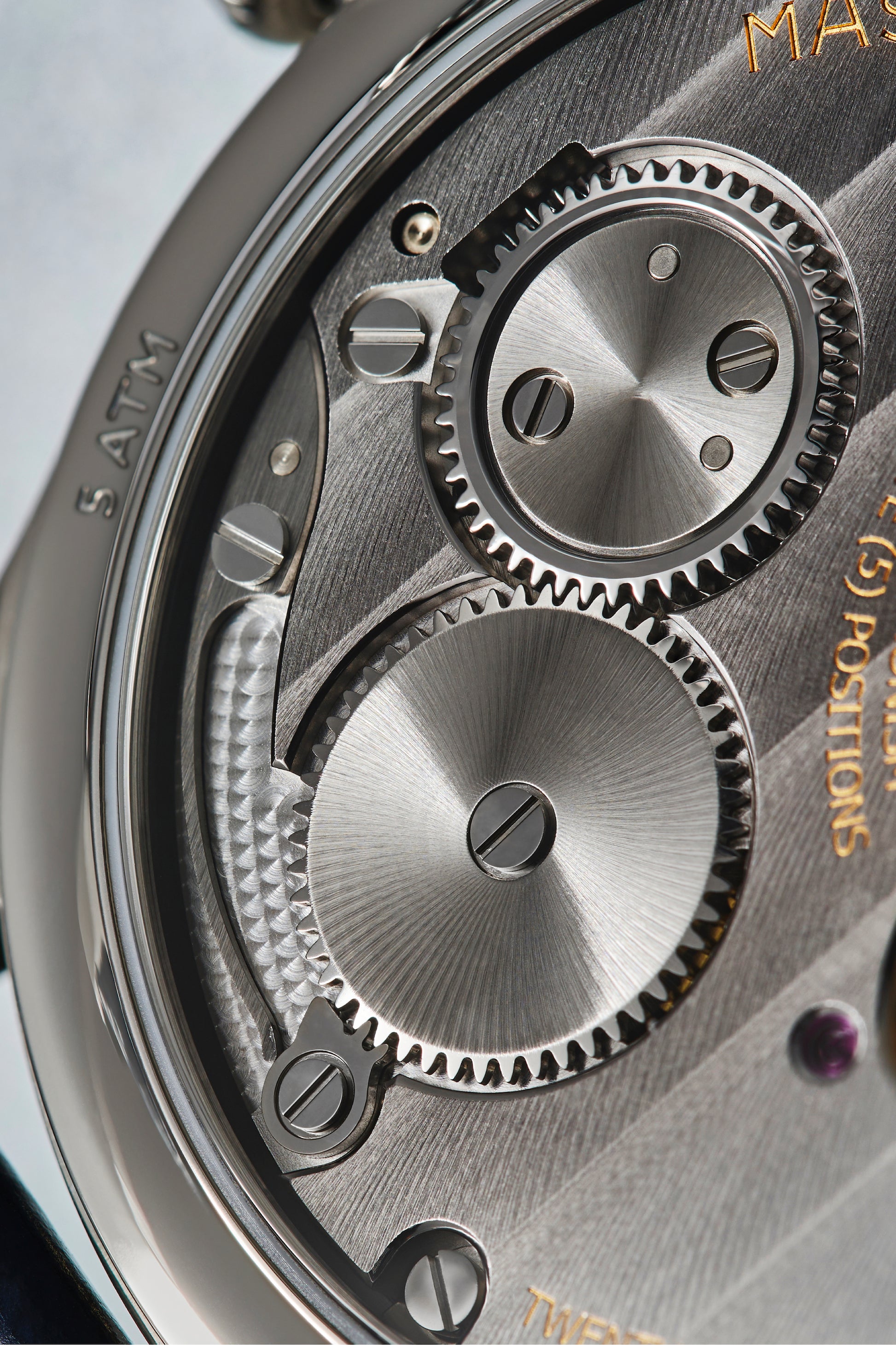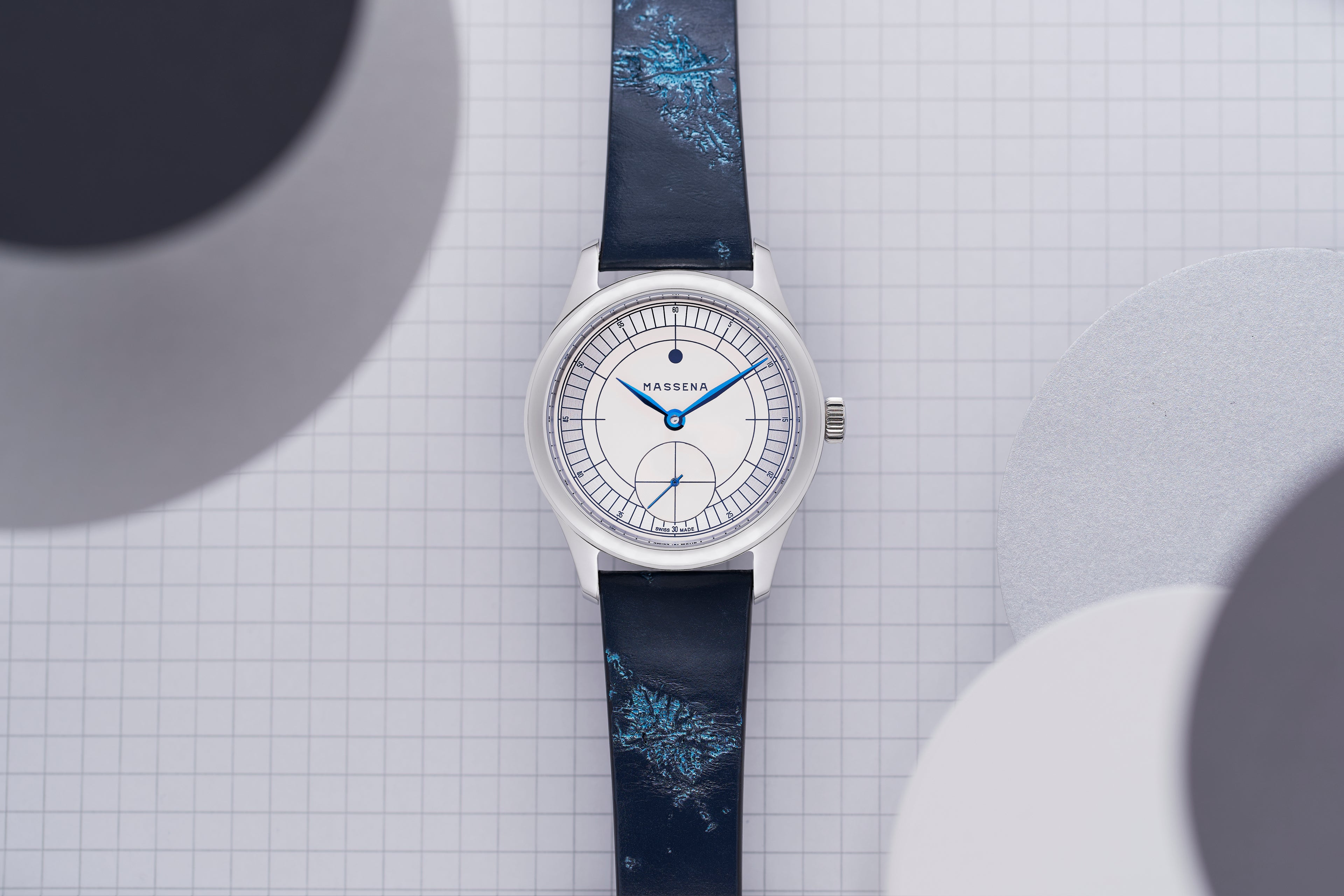 The Magraph features watch straps by Jean Rousseau Paris designed exclusively for Massena LAB. The straps are constructed from sustainably-sourced sturgeon skin, dyed deep indigo, and painted with iridescent, turquoise accents. The straps are then lined with rubber.