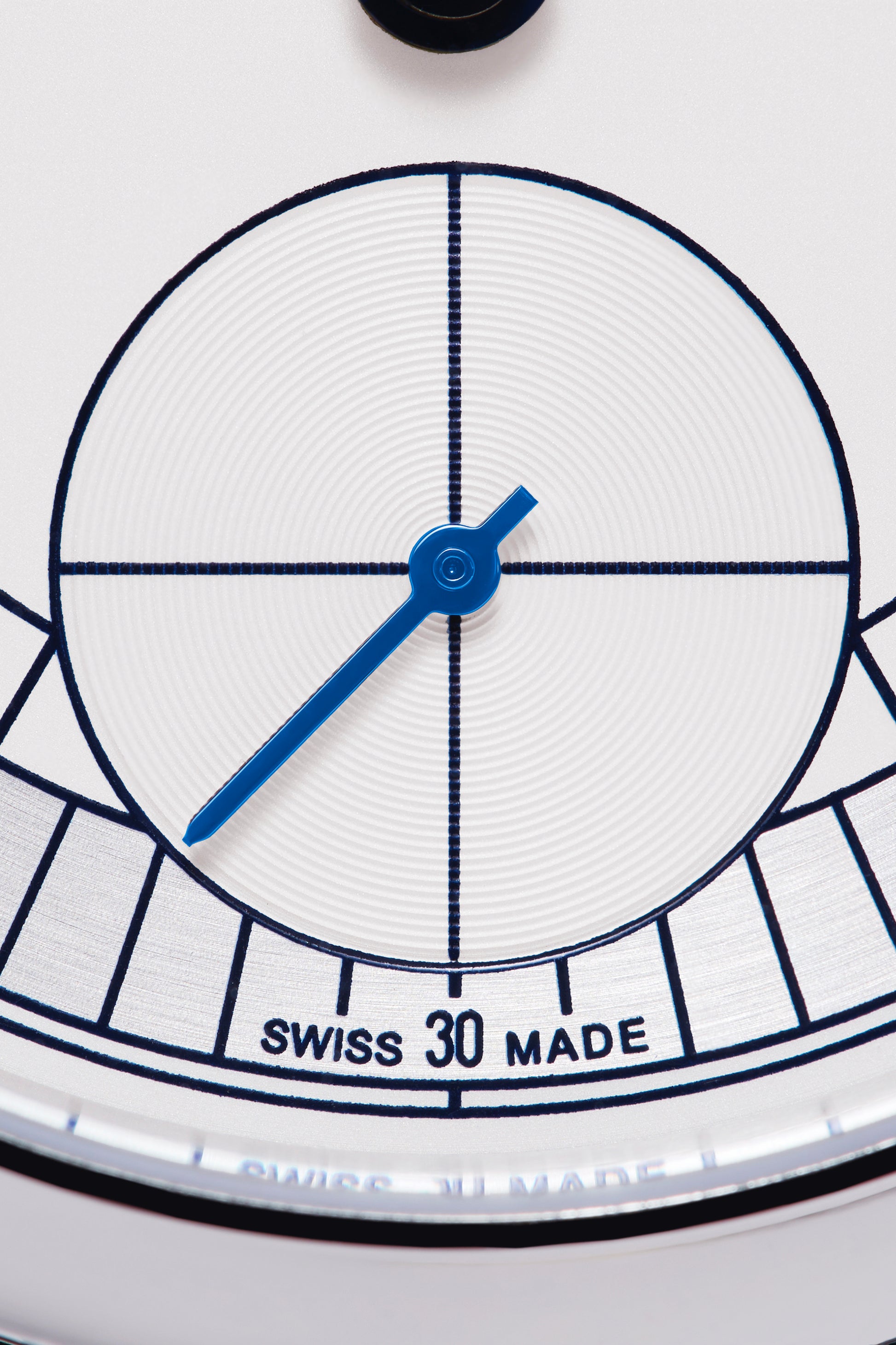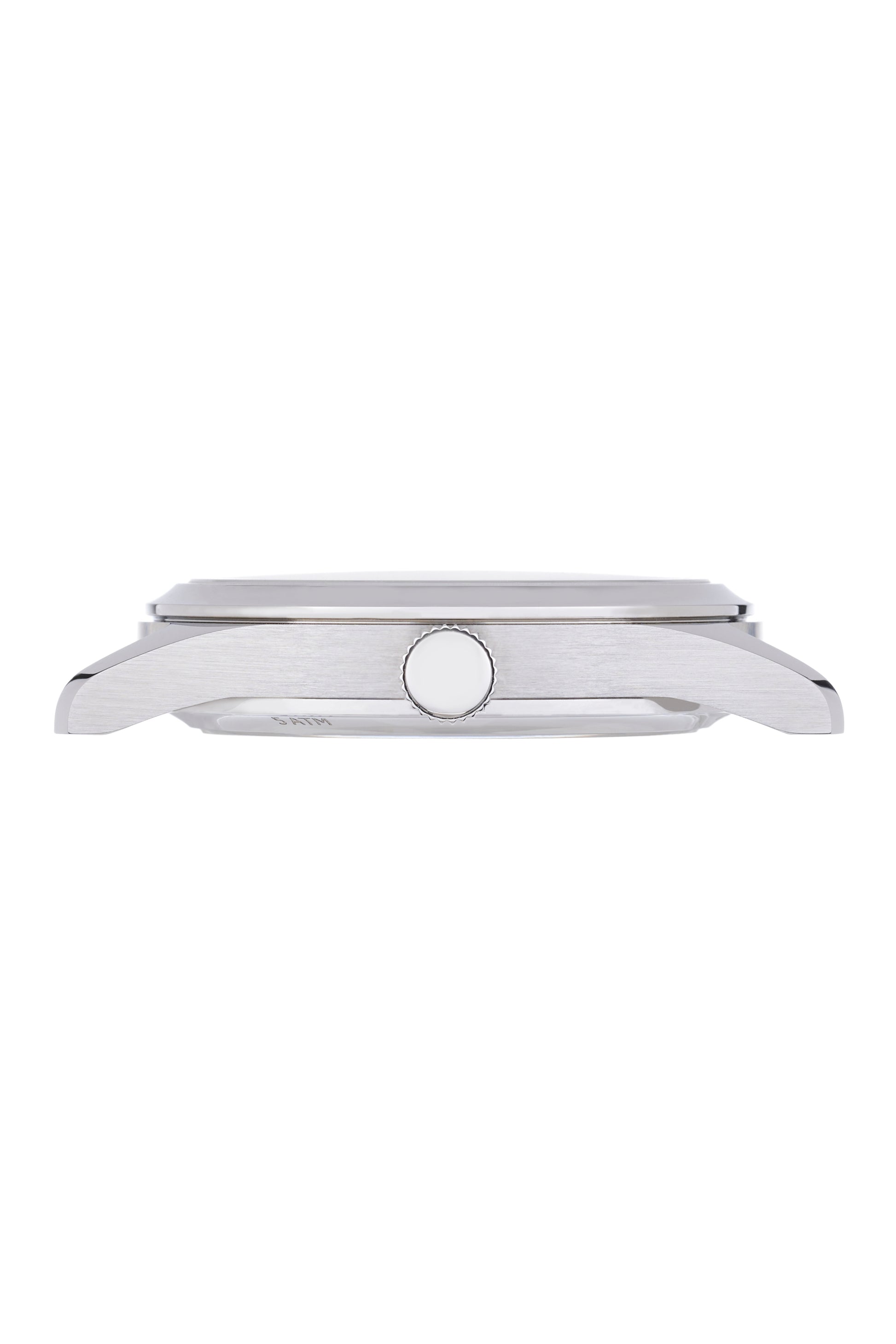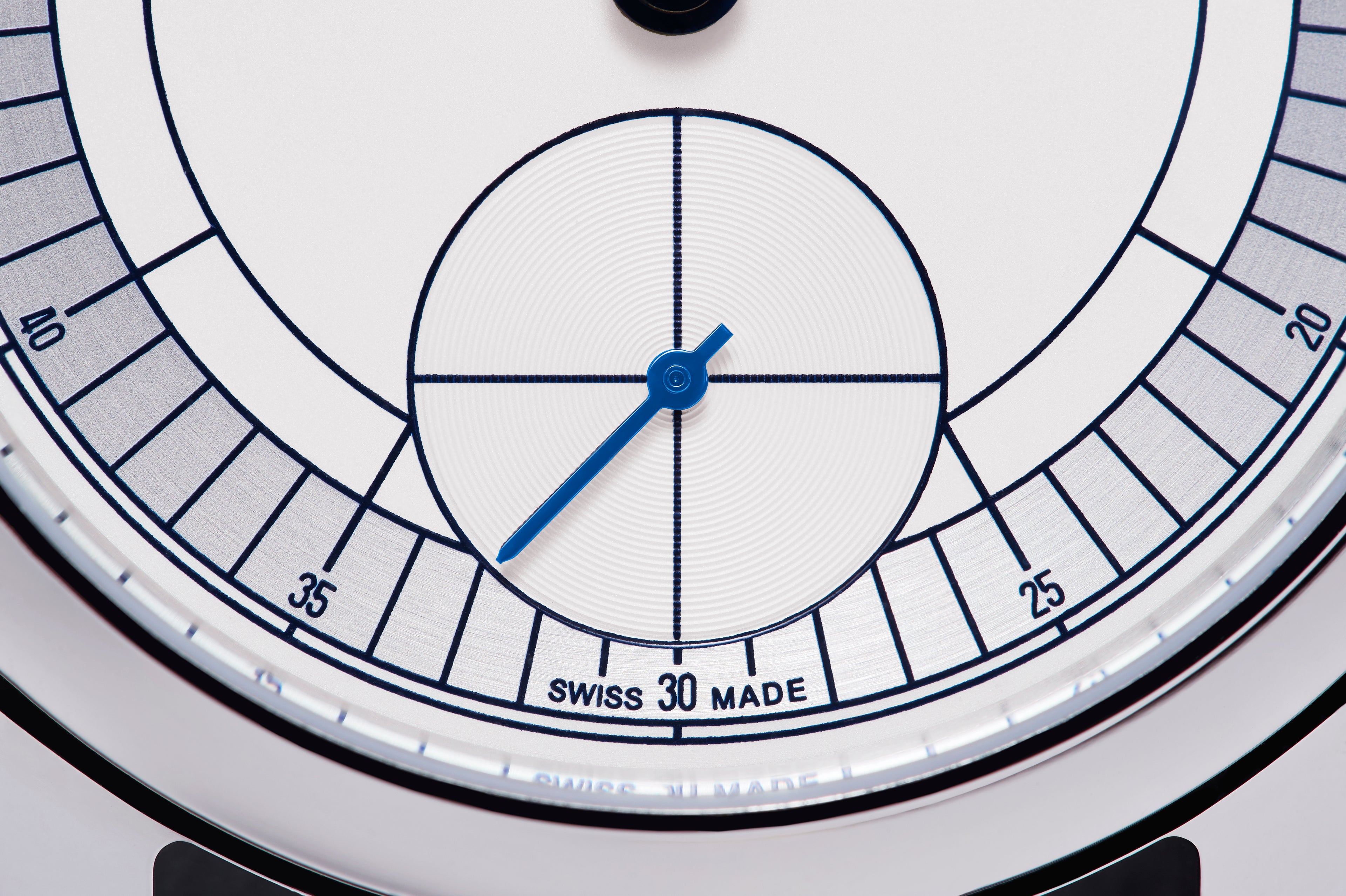 • Subtle, off-white dial with rhodium-plated and circularly-grained outermost sector ring.