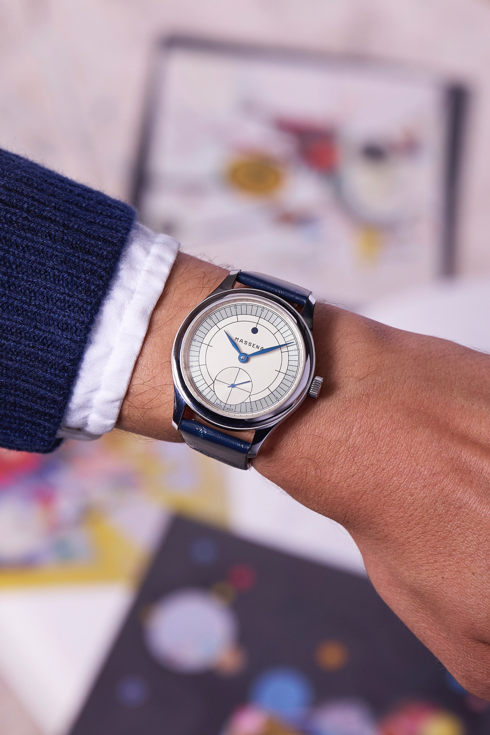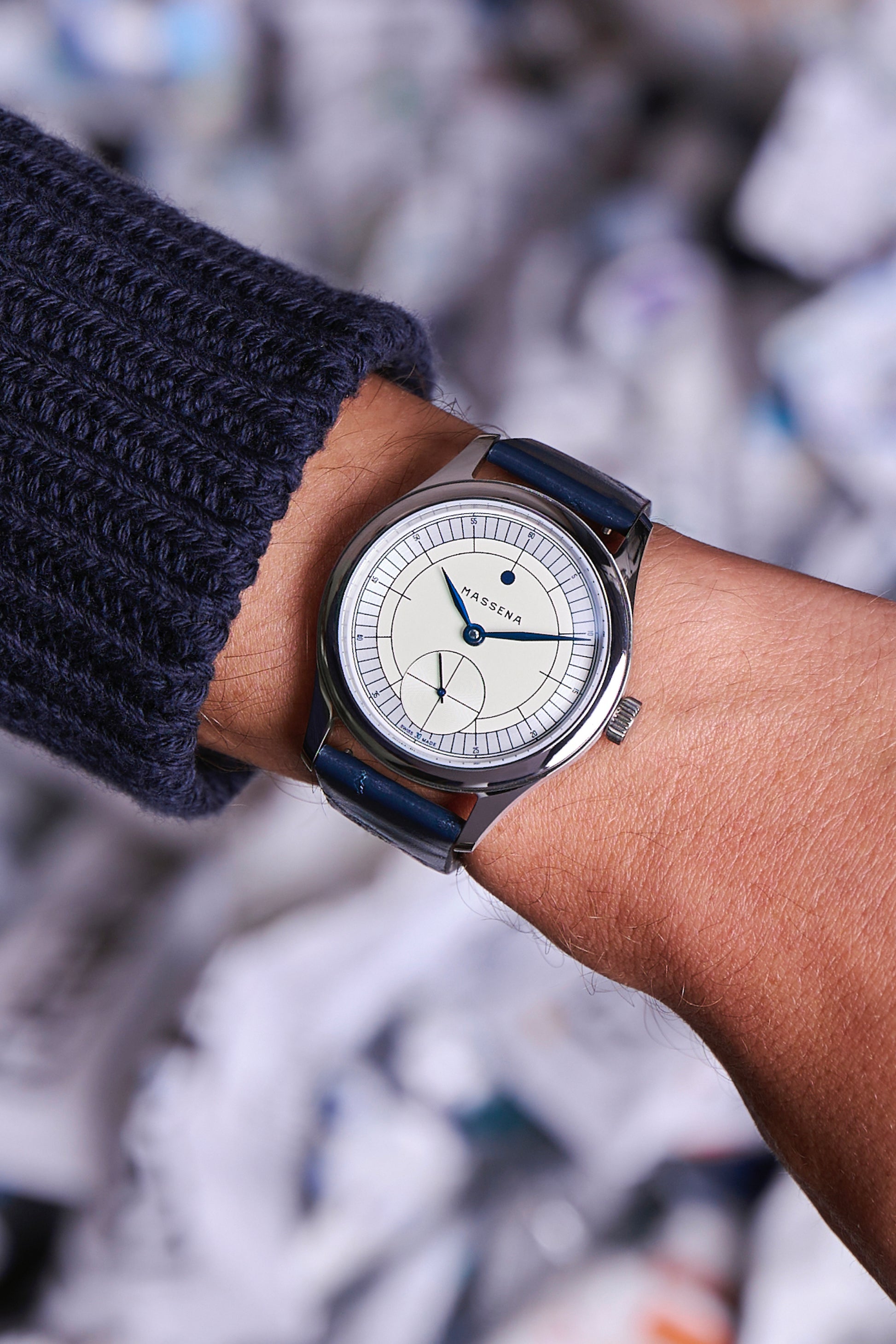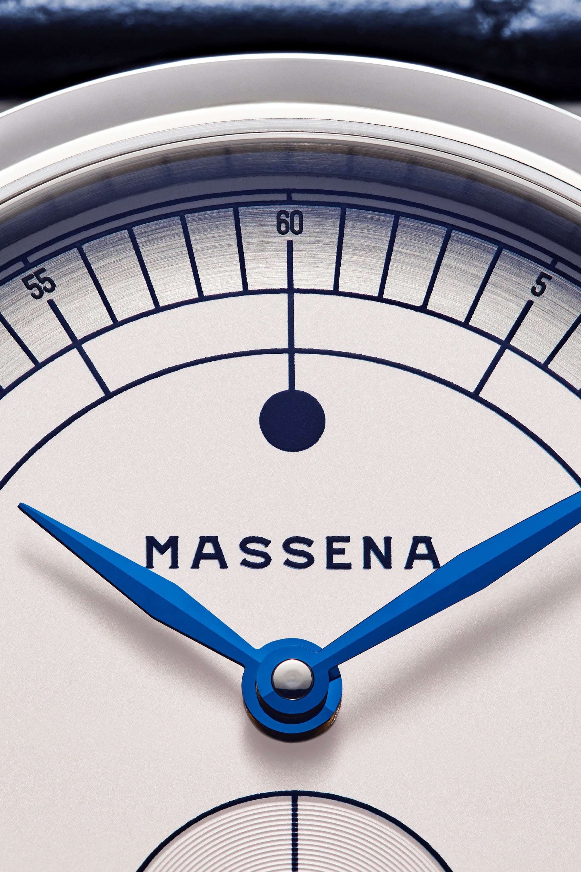 • Exclusive strap design from Jean Rousseau Paris for Massena LAB: sustainable sturgeon skin leather straps with rubber lining. Deep blue indigo with turquoise accents. Watch also to be delivered with a second strap, in black calfskin.
