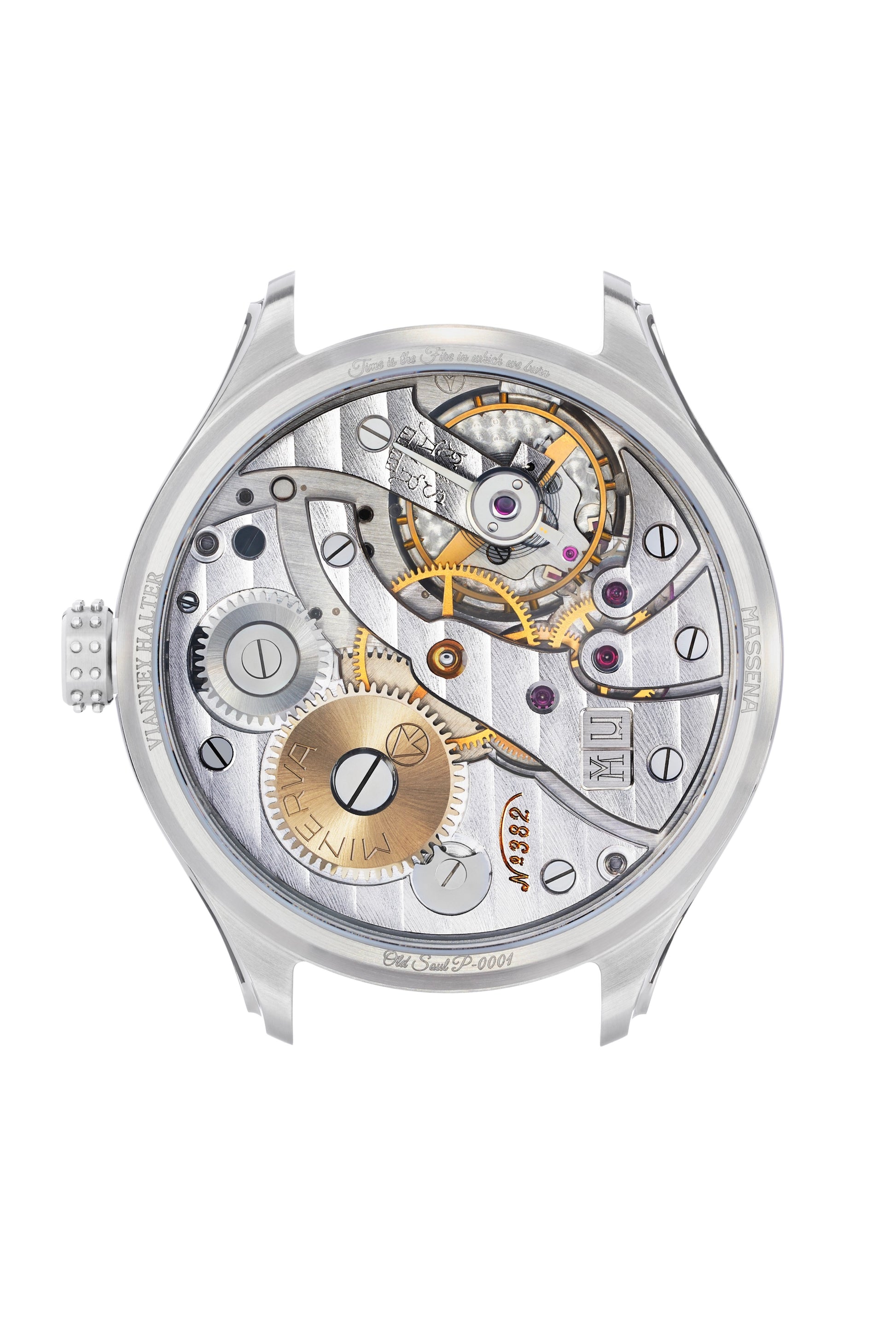 The case back of Old Soul is signed with the signatures of both Vianney Halter and Massena LAB as well as a unique serial number. At the top of the case, between the lugs is a fine engraving: “Time is the Fire in which we burn,” borrowed from the American poet Delmore Schwartz (1913-1966).