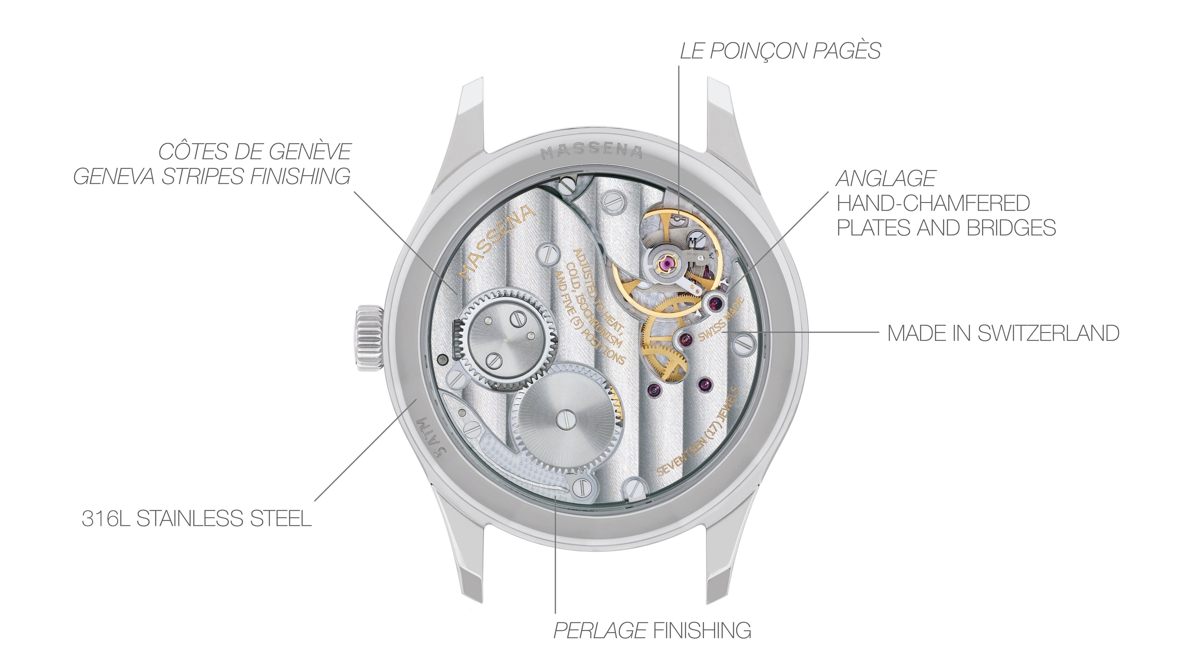• Manual-winding, Massena LAB proprietary caliber M690. Designed by Massena LAB in collaboration with Raúl Pagès.