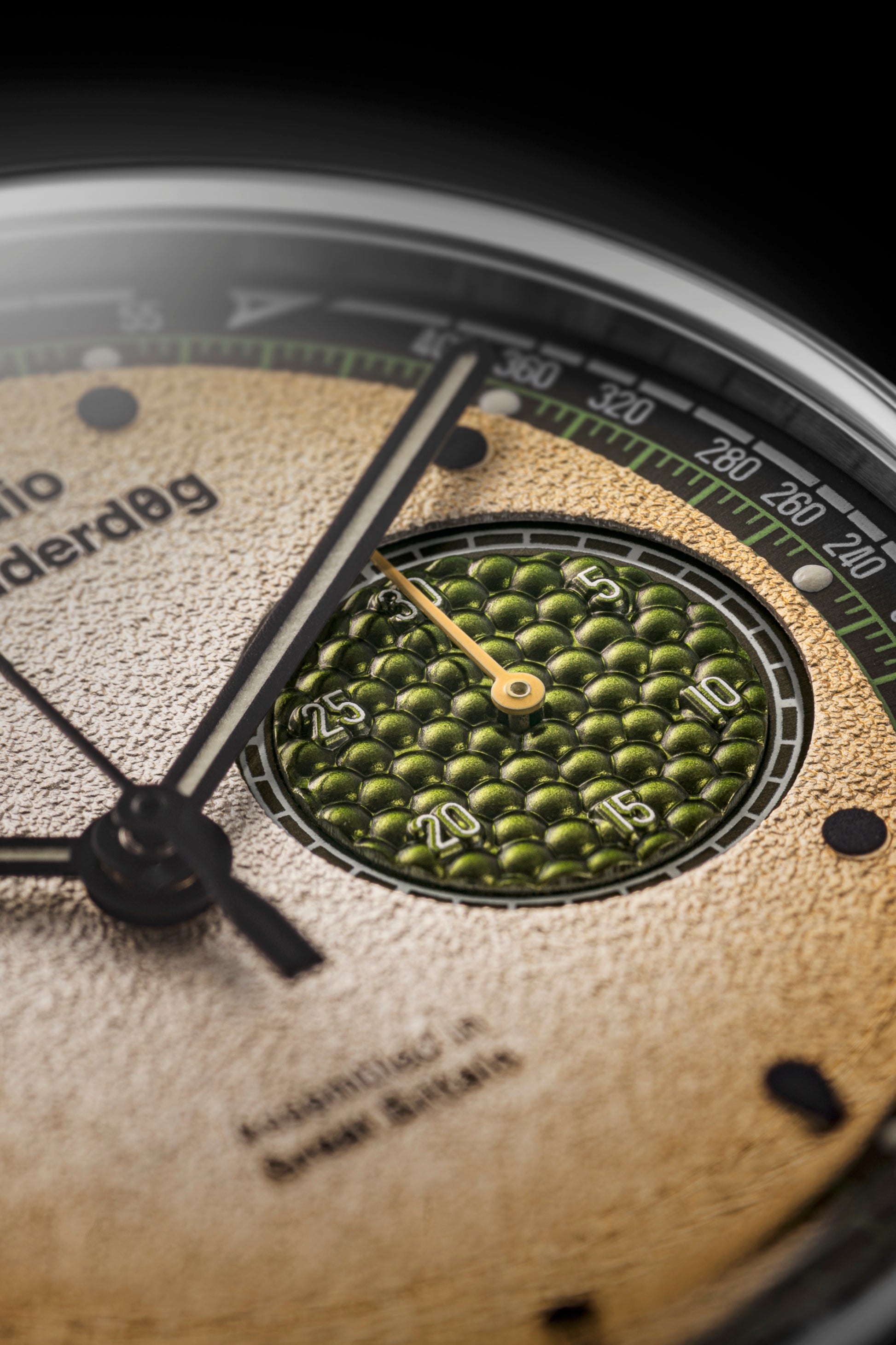 Glistening, champagne-colored dial with oversized "big-eye" caviar subsidiary dial and champagne bottle chronograph hand.