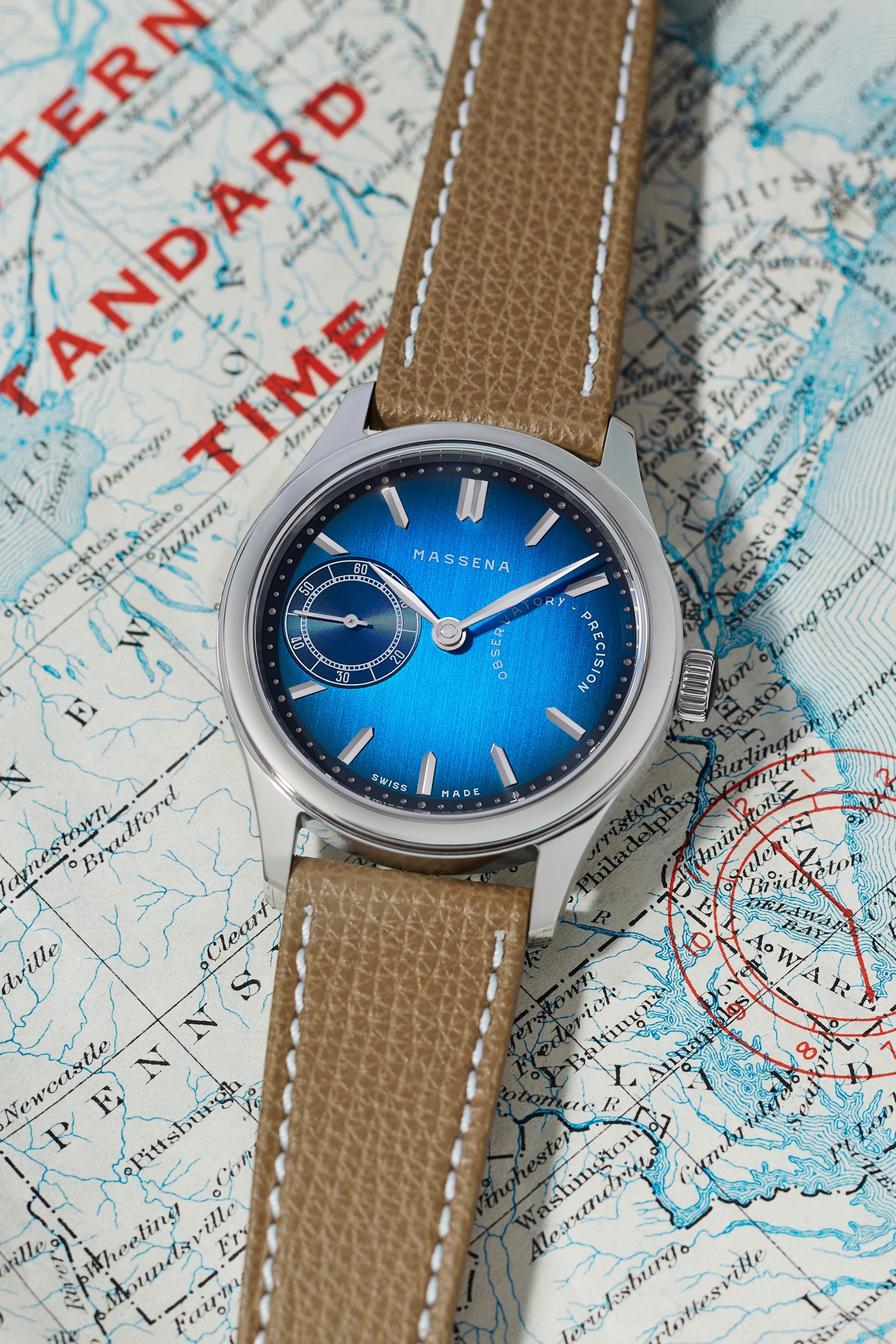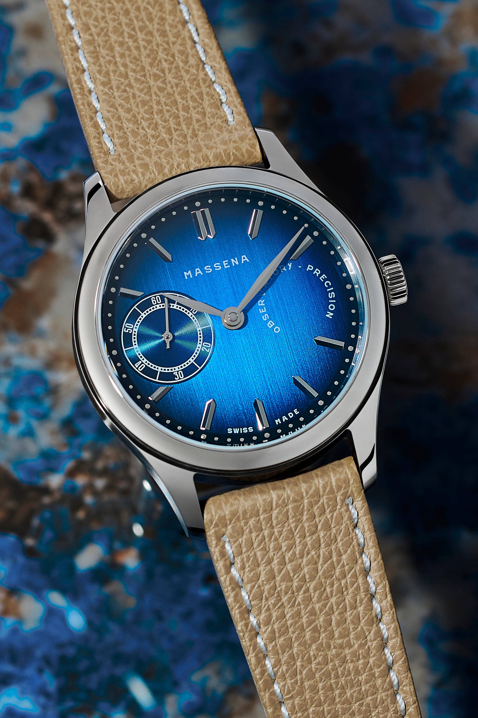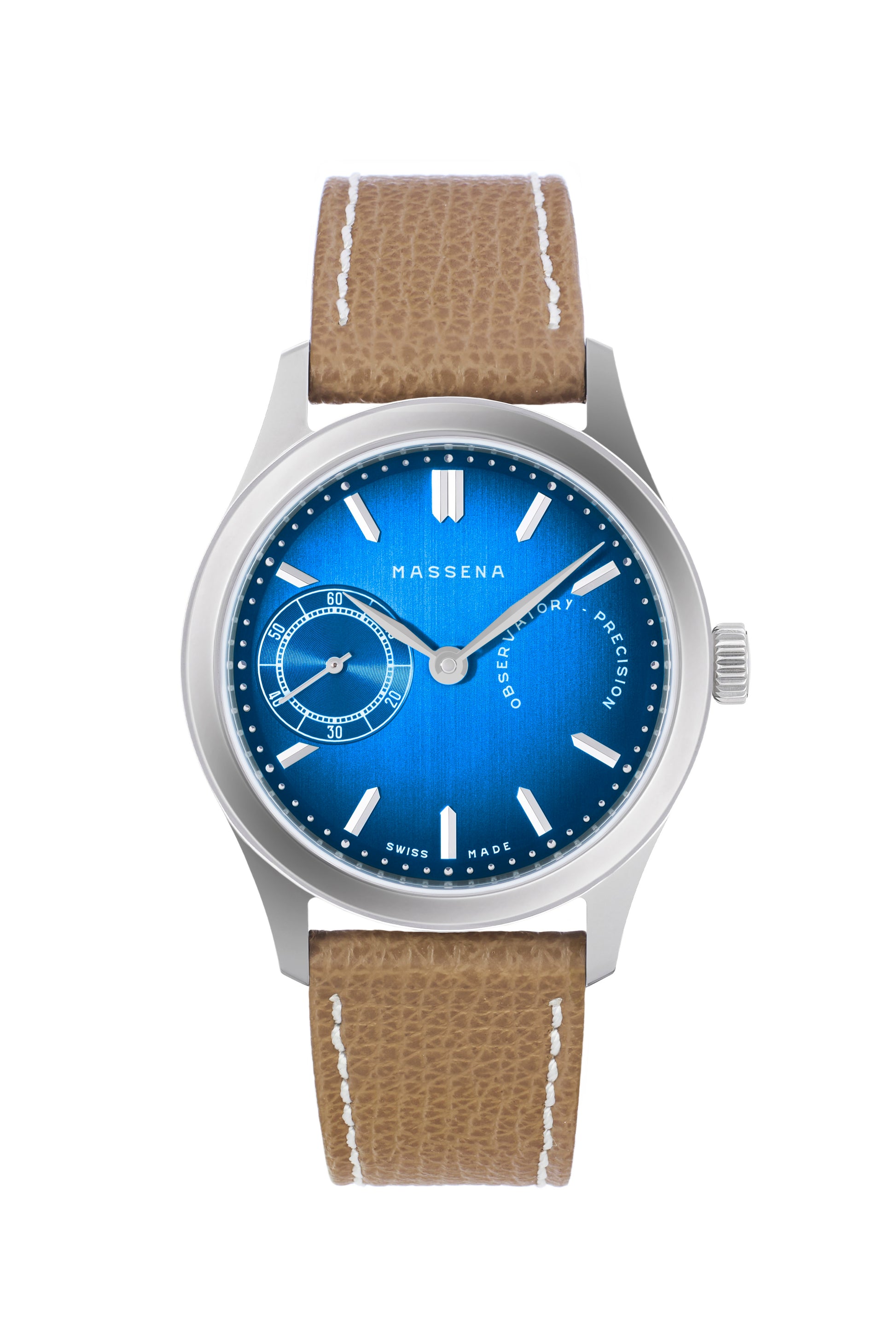• Warm mocha pebbled calfskin leather strap with white stitching. Handmade in Italy. Stainless steel pin buckle with Massena signature.