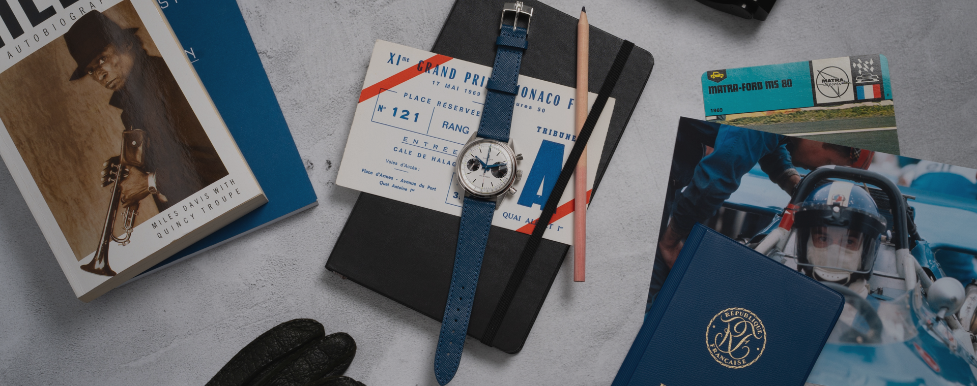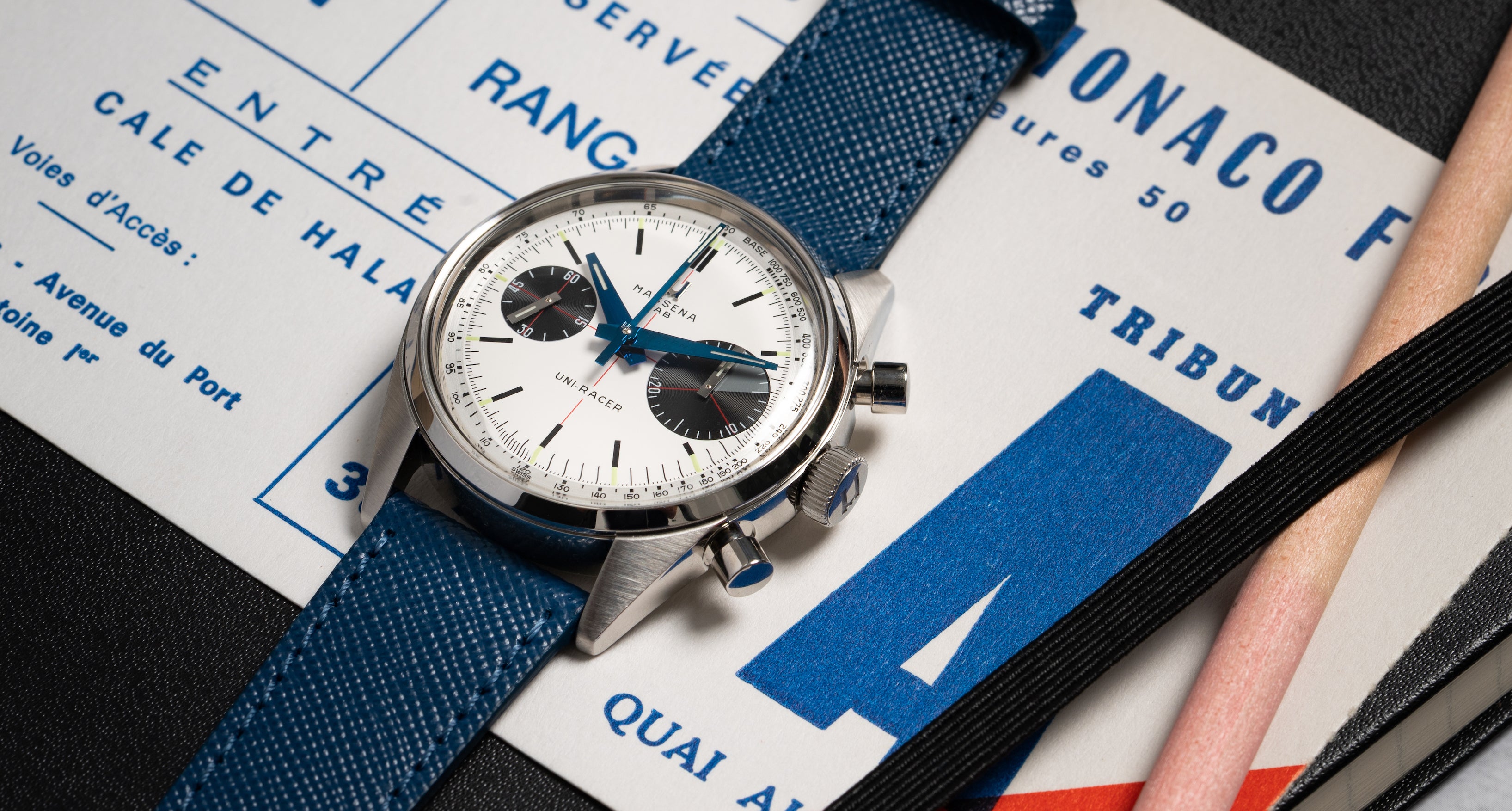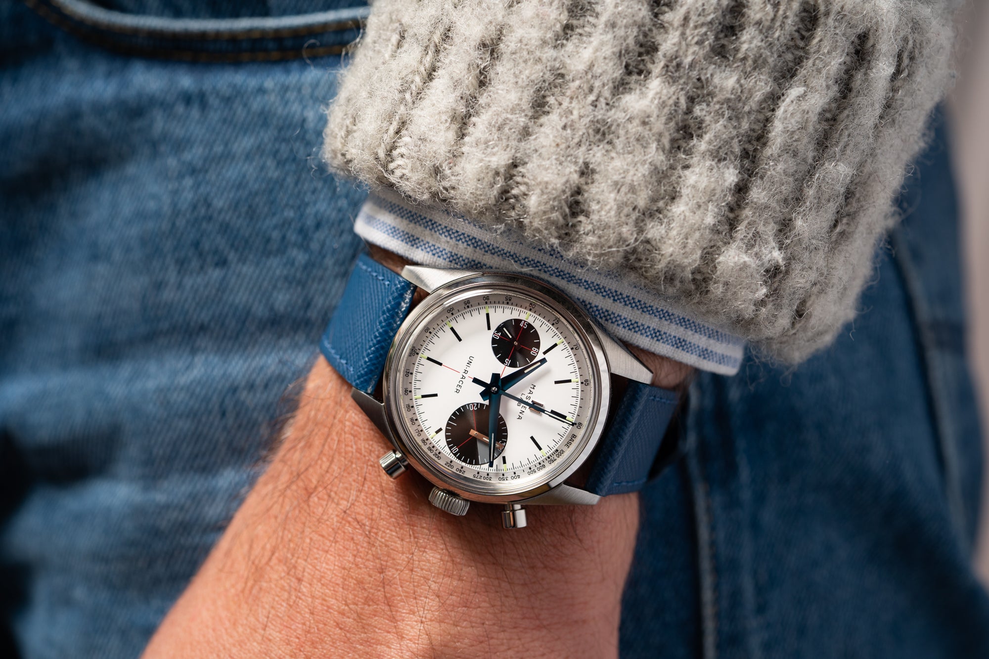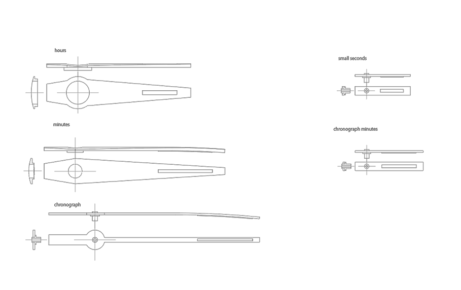 • Center-mounted hour hand, minute hand and chronograph second hand, small seconds at 9 and thirty-minute counter at 3.