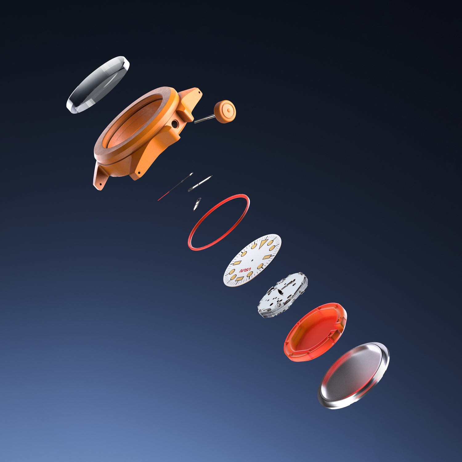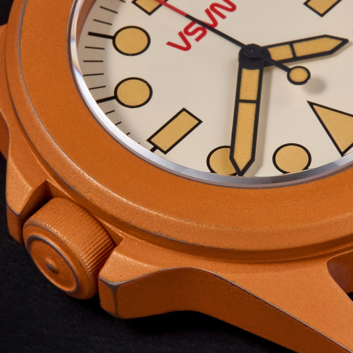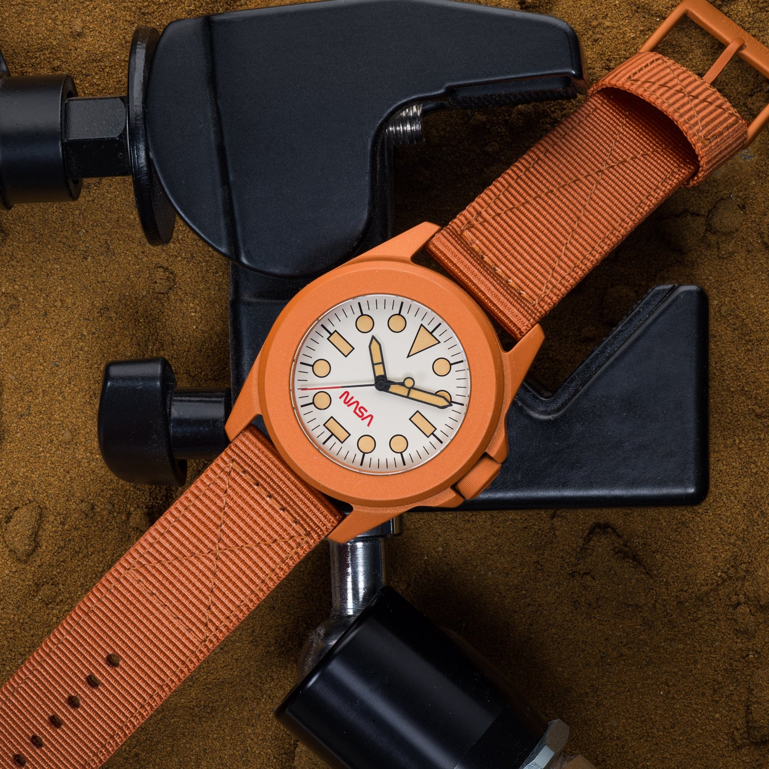• Burnt orange sport nylon strap with burnt orange buckle in stainless steel with Cerakote™ coating.