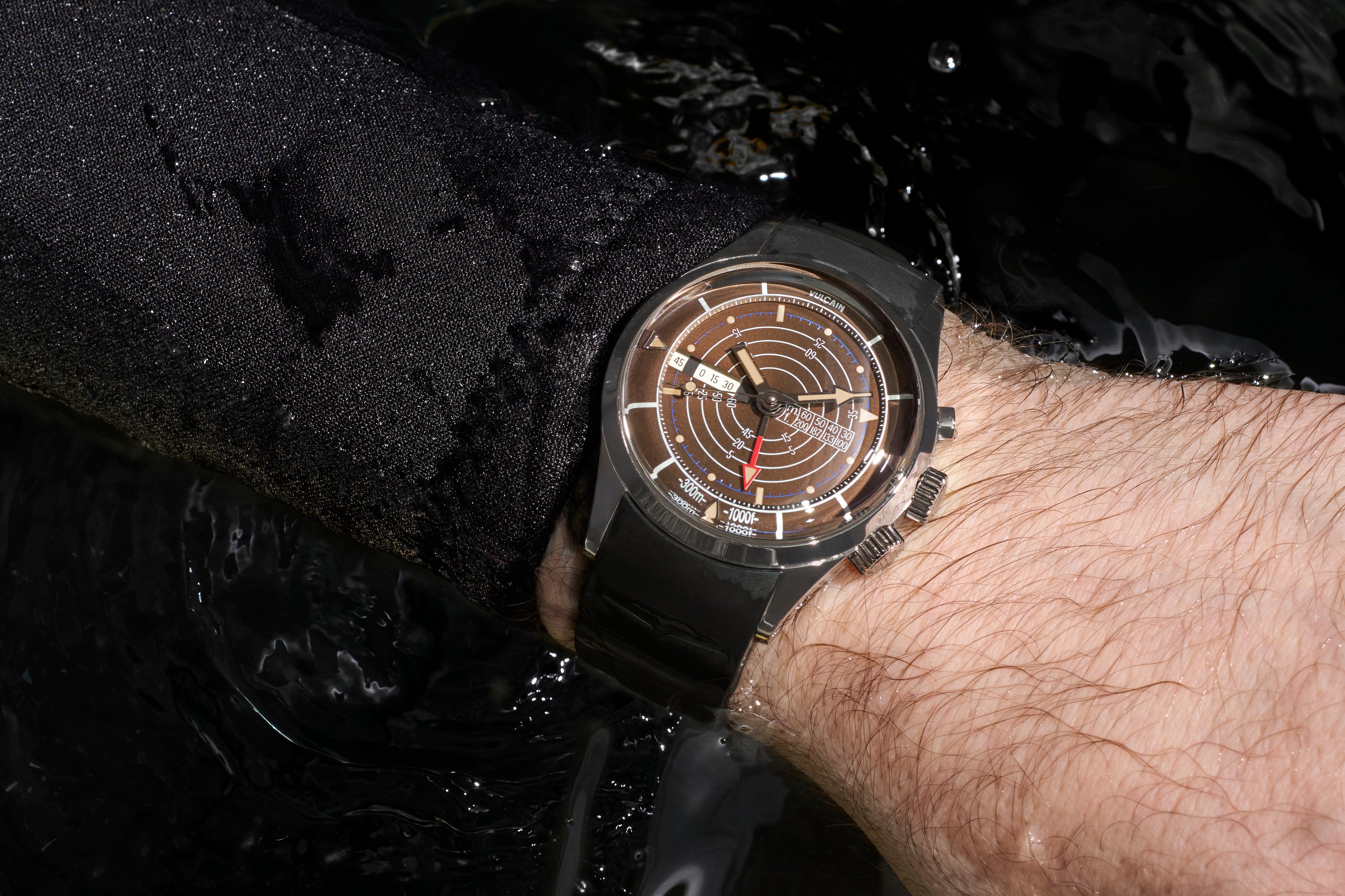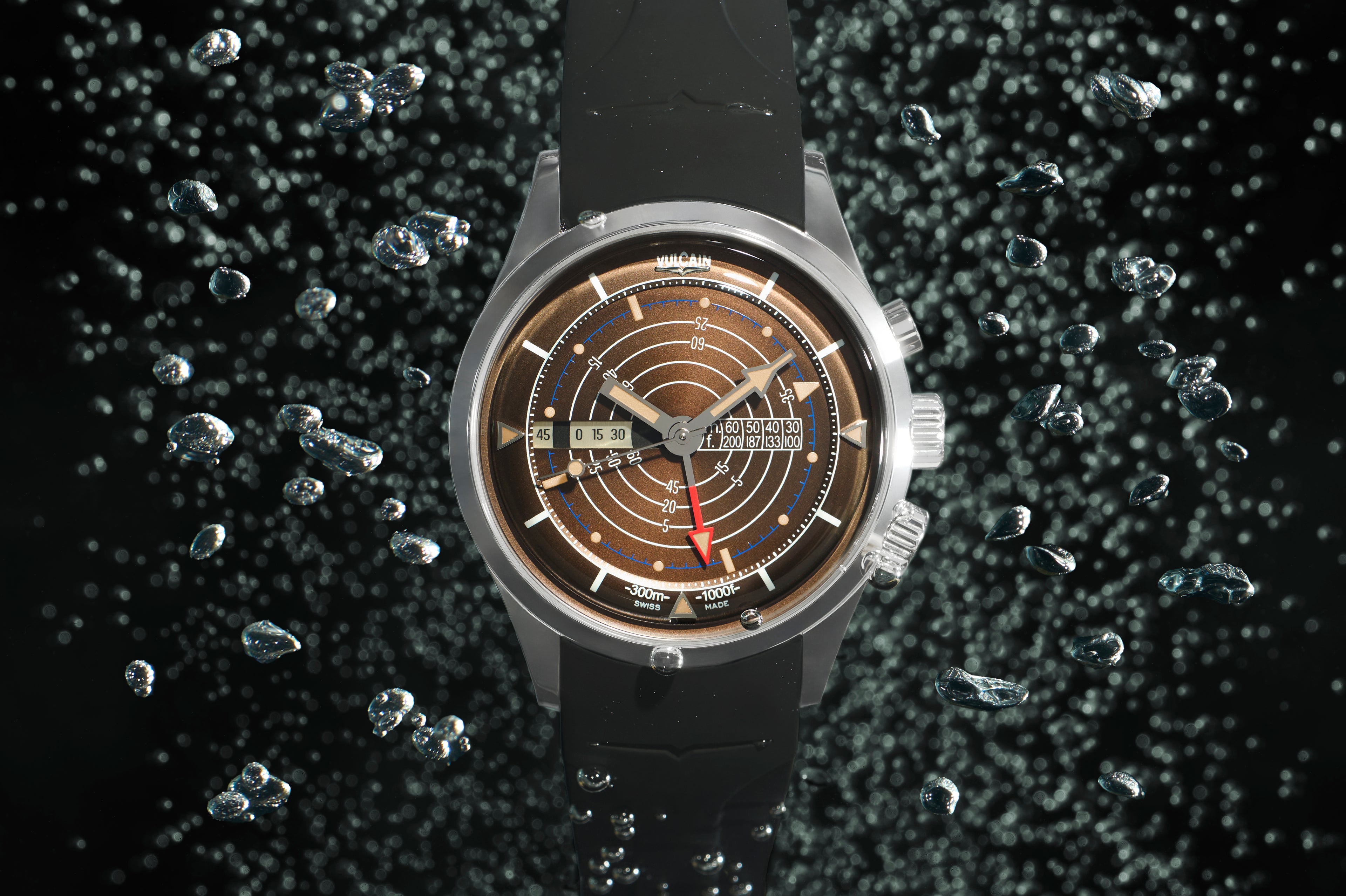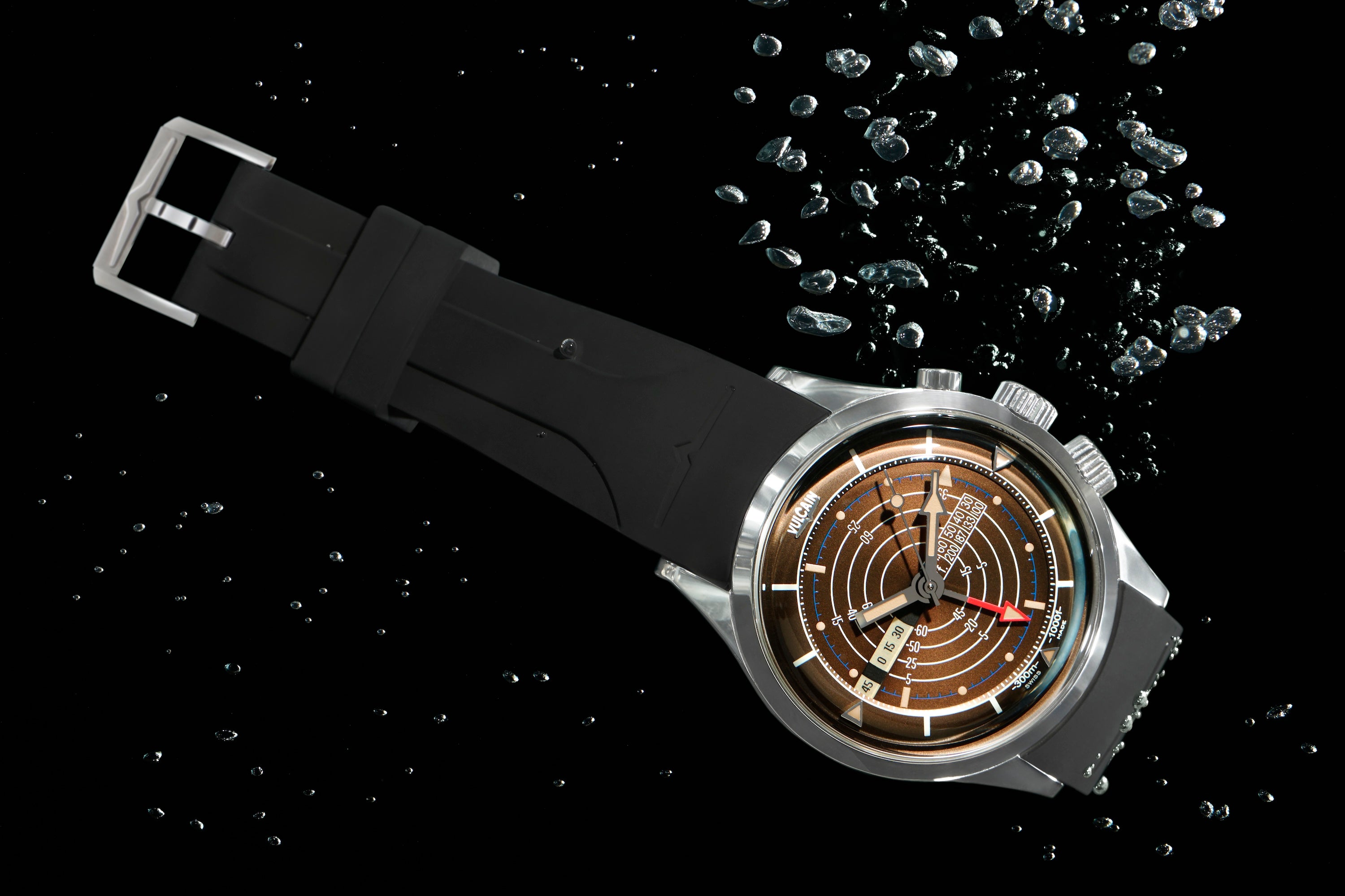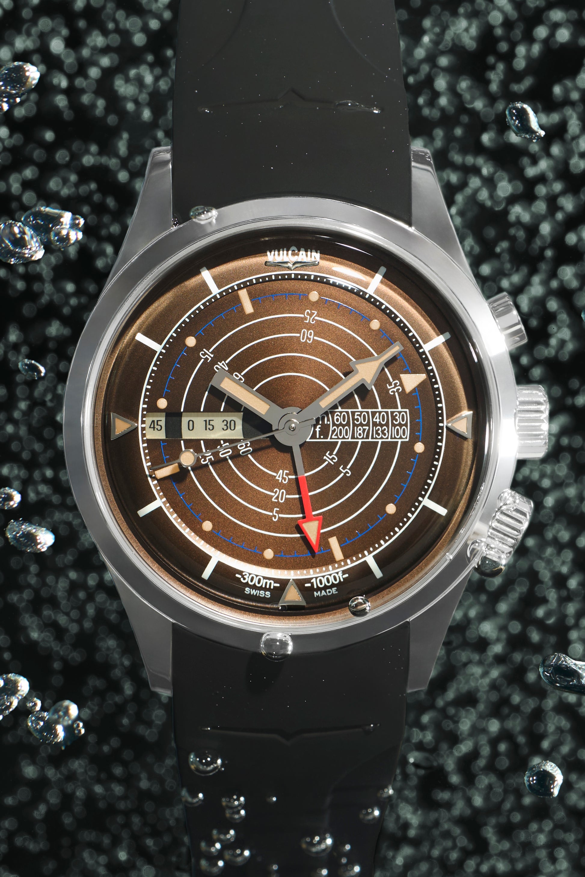• Double dial rotates when the crown at 4 o'clock is turned. Decompression scale revealed through aperture on upper dial.