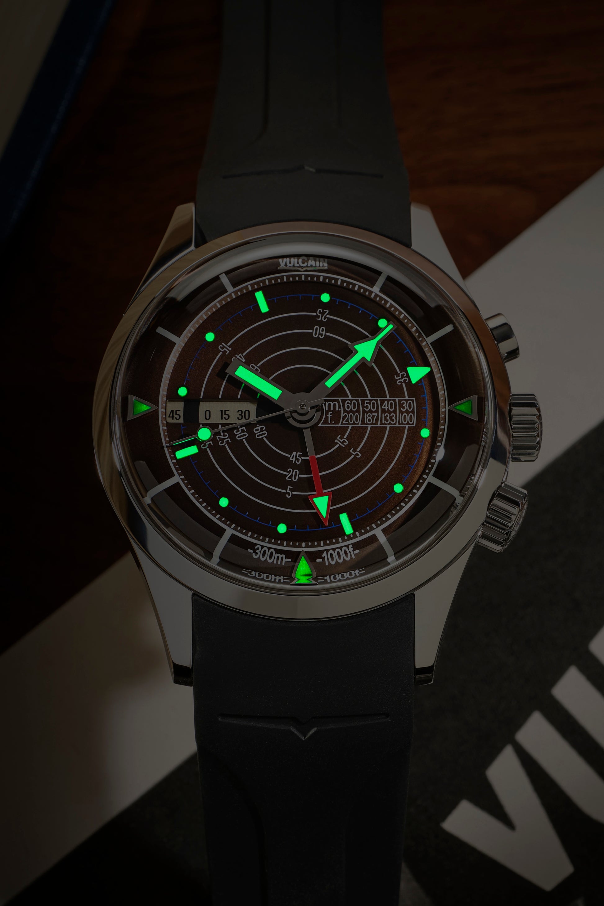 • Brown dial with white and blue markers and beige lume. Lume glows green in low light.